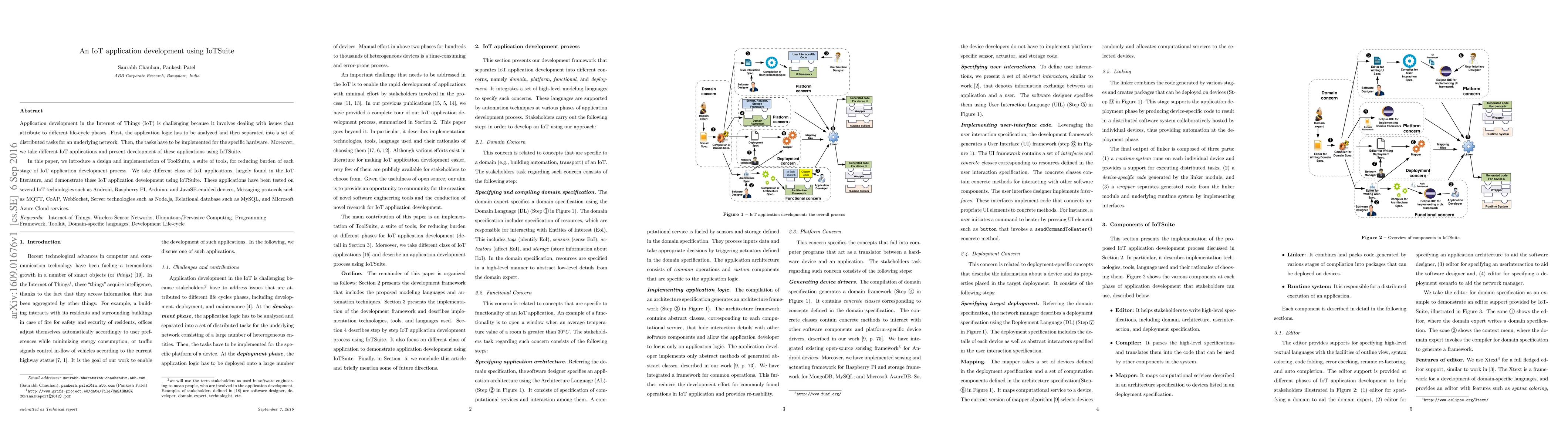 This paper presents the development of IoTSuite, a suite of tools designed to simplify the IoT application development process by addressing various life-cycle stages, from task distribution to hardware implementation. The authors demonstrate the effectiveness of IoTSuite through various IoT applications tested across multiple technologies and platforms.