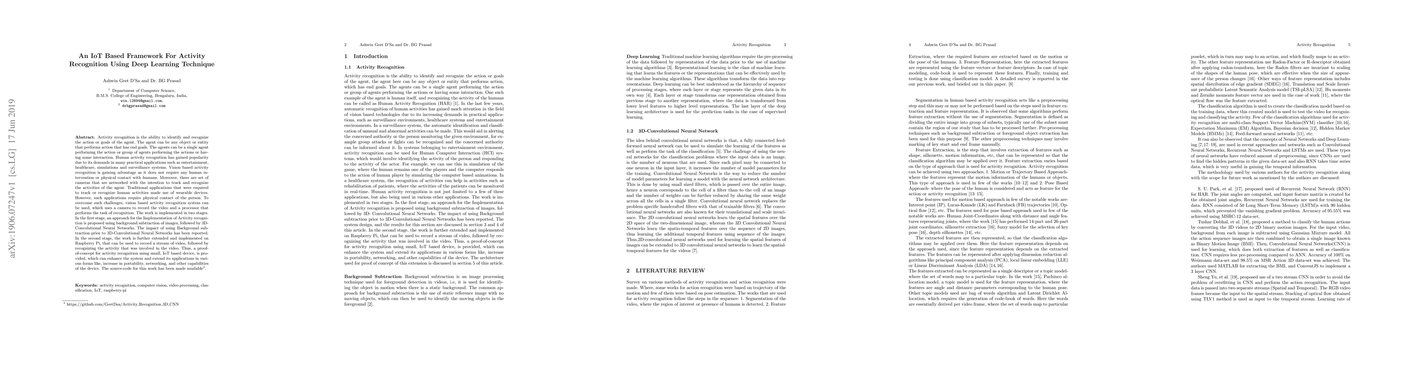 Activity recognition is the ability to identify and recognize the action or goals of the agent. The agent can be any object or entity that performs action that has end goals. The agents can be a single agent performing the action or group of agents performing the actions or having some interaction. Human activity recognition has gained popularity due to its demands in many practical applications such as entertainment, healthcare, simulations and surveillance systems. Vision based activity recognition is gaining advantage as it does not require any human intervention or physical contact with humans. Moreover, there are set of cameras that are networked with the intention to track and recognize the activities of the agent. Traditional applications that were required to track or recognize human activities made use of wearable devices. However, such applications require physical contact of the person. To overcome such challenges, vision based activity recognition system can be used, which uses a camera to record the video and a processor that performs the task of recognition. The work is implemented in two stages. In the first stage, an approach for the Implementation of Activity recognition is proposed using background subtraction of images, followed by 3D- Convolutional Neural Networks. The impact of using Background subtraction prior to 3D-Convolutional Neural Networks has been reported. In the second stage, the work is further extended and implemented on Raspberry Pi, that can be used to record a stream of video, followed by recognizing the activity that was involved in the video. Thus, a proof-of-concept for activity recognition using small, IoT based device, is provided, which can enhance the system and extend its applications in various forms like, increase in portability, networking, and other capabilities of the device.