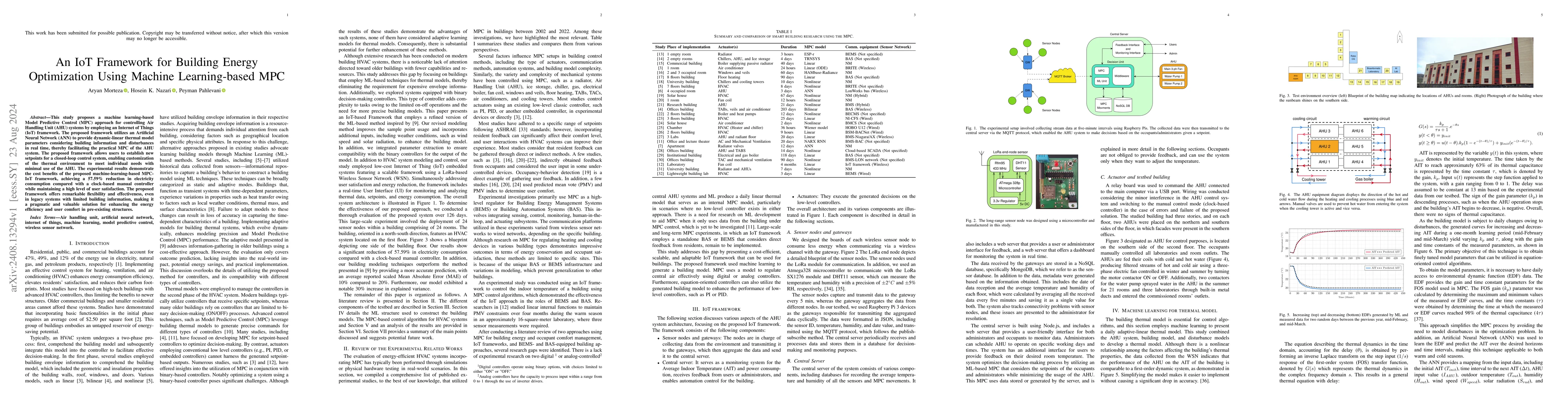 This paper introduces an IoT-enabled machine learning-based MPC approach to optimize Air Handling Unit systems, achieving a 57.59% reduction in electricity use compared to traditional controllers while enhancing user comfort. The framework uses ANN for real-time thermal model adjustments and facilitates custom control settings.