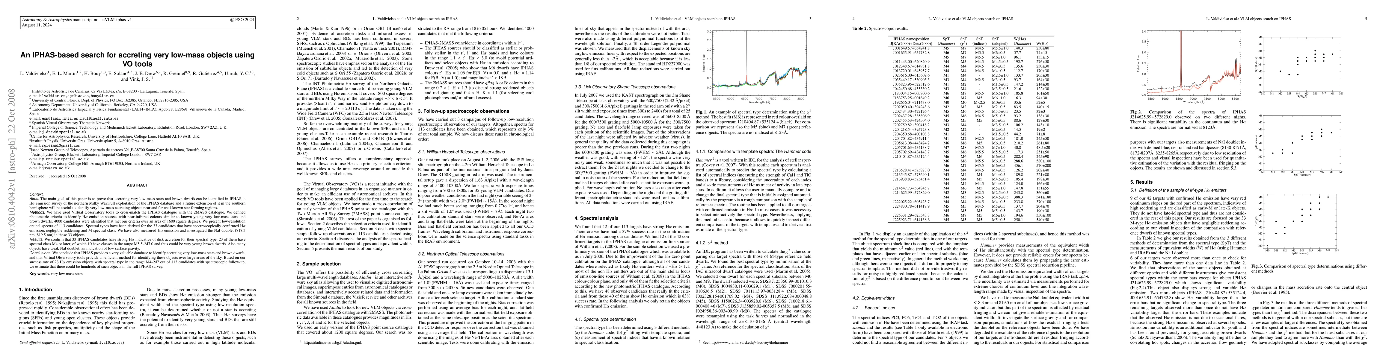 The main goal of this paper is to prove that accreting very low-mass stars and brown dwarfs can be identified in IPHAS, a Halpha emission survey of the northern Milky Way.Full exploitation of the IPHAS database and a future extension of it in the southern hemisphere will be useful to identify very low-mass accreting objects near and far well-known star forming regions. We have used Virtual Observatory tools to cross-match the IPHAS catalogue with the 2MASS catalogue. We defined photometric criteria to identify Halpha emission sources with near-infrared colours similar to known young very low-mass stars and brown dwarfs. 4000 candidates were identified that met our criteria over an area of 1600 square degrees. We present low-resolution optical spectra of 113 candidates. Spectral types have been derived for the 33 candidates that have spectroscopically confirmed Halpha emission, negligible reddening and M spectral class. We have also measured Halpha emission and investigated the NaI doublet (818.3 nm, 819.5 nm) in these 33 objects. We confirm that 33 IPHAS candidates have strong Halpha indicative of disk accretion for their spectral type. 23 of them have spectral class M4 or later, of which 10 have classes in the range M5.5-M7.0 and thus could be very young brown dwarfs. Also many objects have weak NaI doublet, an indication of low surface gravity.We conclude that IPHAS provides a very valuable database to identify accreting very low-mass stars and brown dwarfs, and that Virtual Observatory tools provide an efficient method for identifying these objects over large areas of the sky. Based on our success rate of 23 Halpha emission objects with spectral type in the range M4-M7 out of 113 candidates with spectroscopic follow-up, we estimate that there could be hundreds of such objects in the full IPHAS survey.