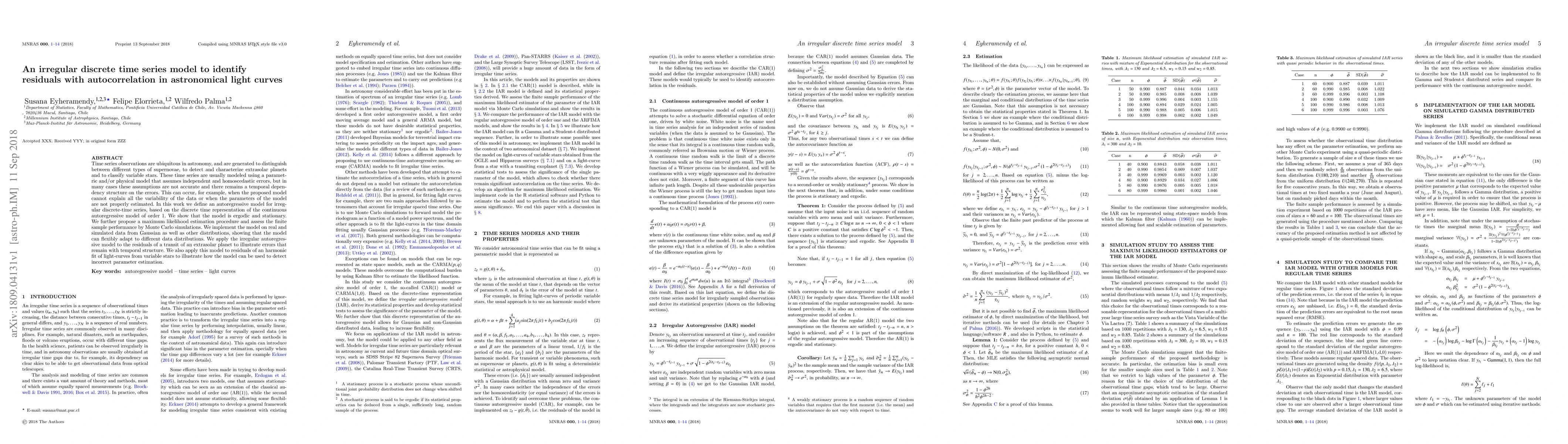 Time series observations are ubiquitous in astronomy, and are generated to distinguish between different types of supernovae, to detect and characterize extrasolar planets and to classify variable stars. These time series are usually modeled using a parametric and/or physical model that assumes independent and homoscedastic errors, but in many cases these assumptions are not accurate and there remains a temporal dependency structure on the errors. This can occur, for example, when the proposed model cannot explain all the variability of the data or when the parameters of the model are not properly estimated. In this work we define an autoregressive model for irregular discrete-time series, based on the discrete time representation of the continuous autoregressive model of order 1. We show that the model is ergodic and stationary. We further propose a maximum likelihood estimation procedure and assess the finite sample performance by Monte Carlo simulations. We implement the model on real and simulated data from Gaussian as well as other distributions, showing that the model can flexibly adapt to different data distributions. We apply the irregular autoregressive model to the residuals of a transit of an extrasolar planet to illustrate errors that remain with temporal structure. We also apply this model to residuals of an harmonic fit of light-curves from variable stars to illustrate how the model can be used to detect incorrect parameter estimation.