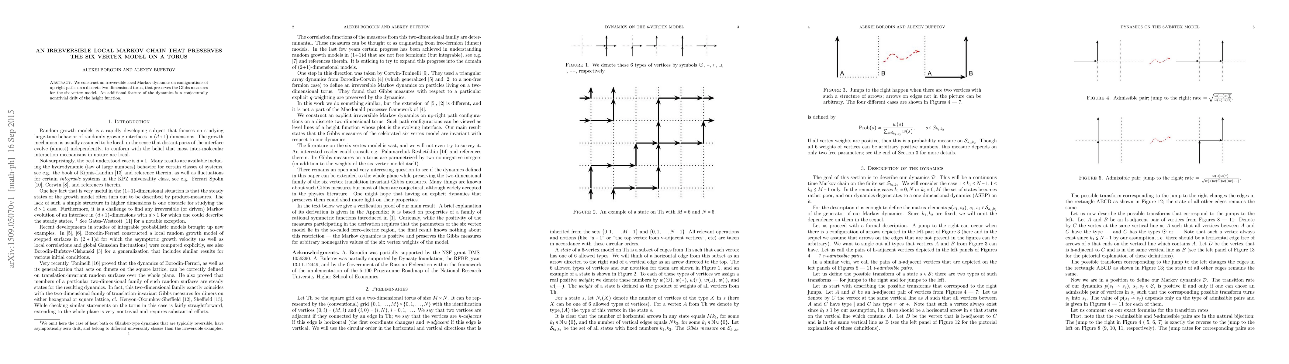 Summary: This paper constructs an irreversible local Markov chain on a torus that maintains the Gibbs measures for the six vertex model, with an additional feature of a potentially nontrivial drift in the height function. The dynamics focus on configurations of up-right paths.