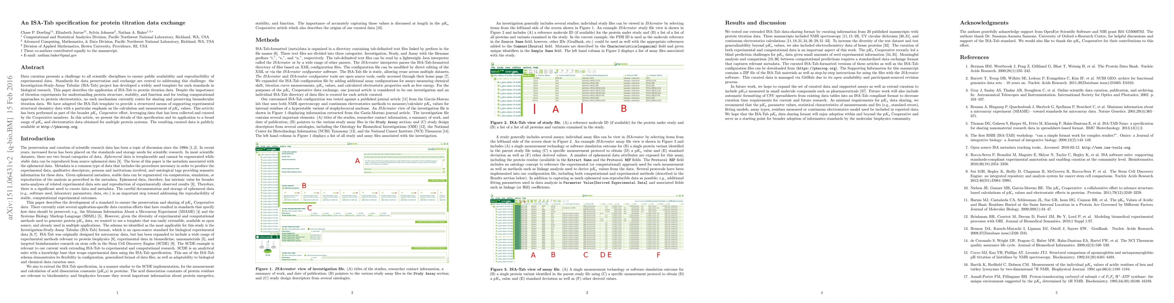 Data curation presents a challenge to all scientific disciplines to ensure public availability and reproducibility of experimental data. Standards for data preservation and exchange are central to addressing this challenge: the Investigation-Study-Assay Tabular (ISA-Tab) project has developed a widely used template for such standards in biological research. This paper describes the application of ISA-Tab to protein titration data. Despite the importance of titration experiments for understanding protein structure, stability, and function and for testing computational approaches to protein electrostatics, no such mechanism currently exists for sharing and preserving biomolecular titration data. We have adapted the ISA-Tab template to provide a structured means of supporting experimental structural chemistry data with a particular emphasis on the calculation and measurement of pKa values. This activity has been performed as part of the broader pKa Cooperative effort, leveraging data that has been collected and curated by the Cooperative members. In this article, we present the details of this specification and its application to a broad range of pKa and electrostatics data obtained for multiple protein systems. The resulting curated data is publicly available at http://pkacoop.org.