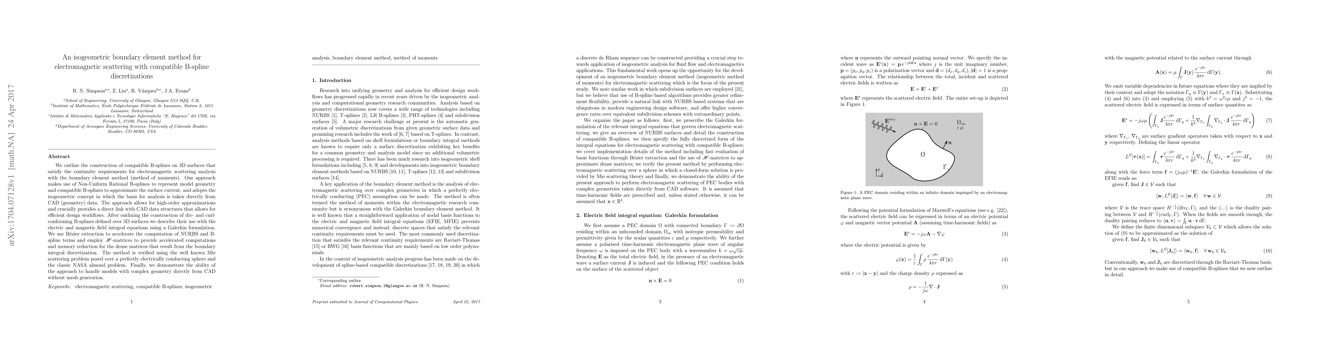 This paper presents an isogeometric boundary element method for electromagnetic scattering using compatible B-splines on 3D surfaces, directly linking CAD geometry data for efficient design workflows. The method employs NURBs and B-splines for high-order approximations and uses H-matrices for accelerated computations, validated through Mie scattering and NASA almond problems.