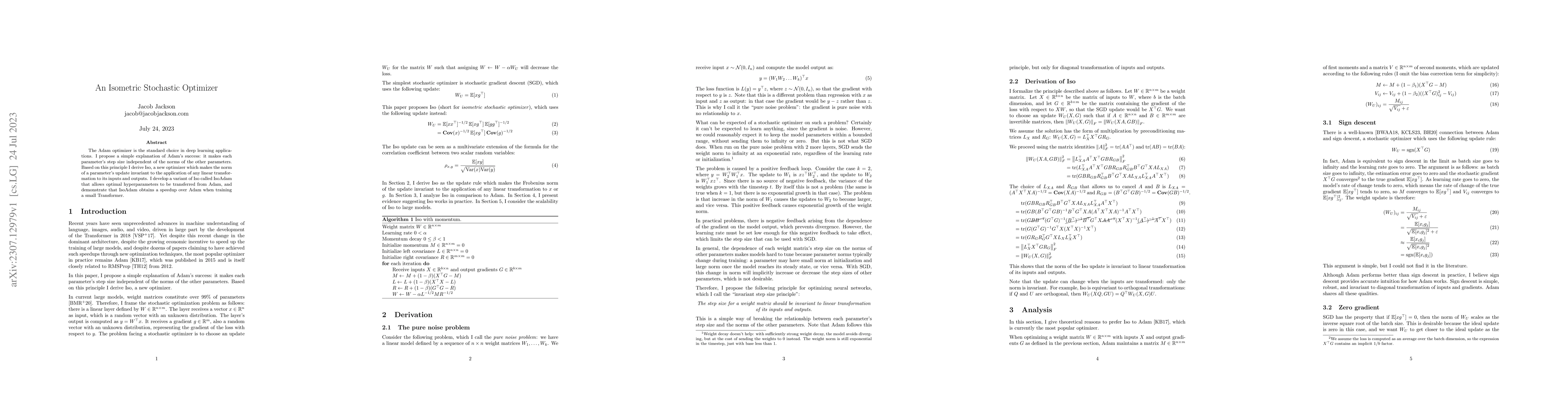 The Adam optimizer is the standard choice in deep learning applications. I propose a simple explanation of Adam's success: it makes each parameter's step size independent of the norms of the other parameters. Based on this principle I derive Iso, a new optimizer which makes the norm of a parameter's update invariant to the application of any linear transformation to its inputs and outputs. I develop a variant of Iso called IsoAdam that allows optimal hyperparameters to be transferred from Adam, and demonstrate that IsoAdam obtains a speedup over Adam when training a small Transformer.