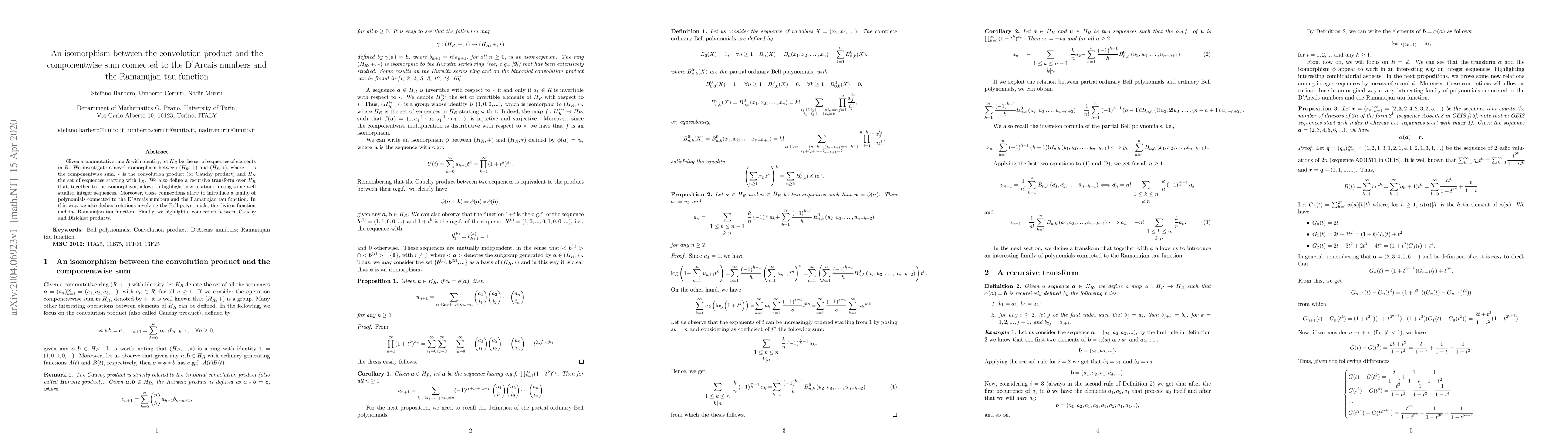 This paper establishes an isomorphism between the componentwise sum and the convolution product in a commutative ring, revealing new relationships between D'Arcais numbers, Ramanujan tau function, and other integer sequences. It also introduces polynomials connected to these sequences and highlights links between Cauchy and Dirichlet products.