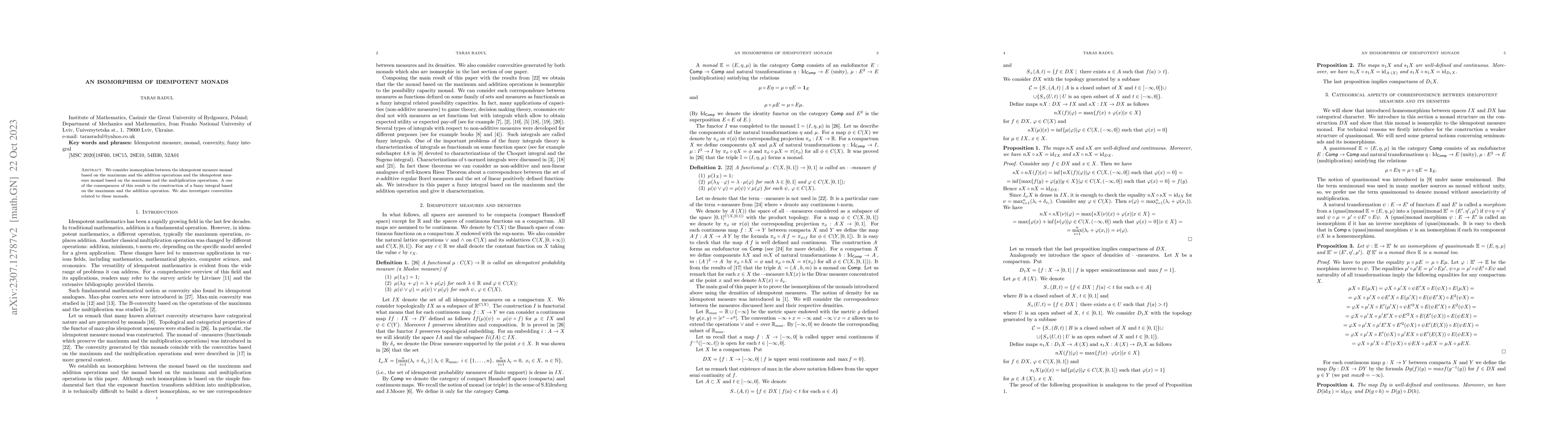 We consider isomorphism between the idempotent measure monad based on the maximum and the addition operations and the idempotent measure monad based on the maximum and the multiplication operations. A one of the consequences of this result is the construction of a fuzzy integral based on the maximum and the addition operation. We also investigate convexities related to these monads.