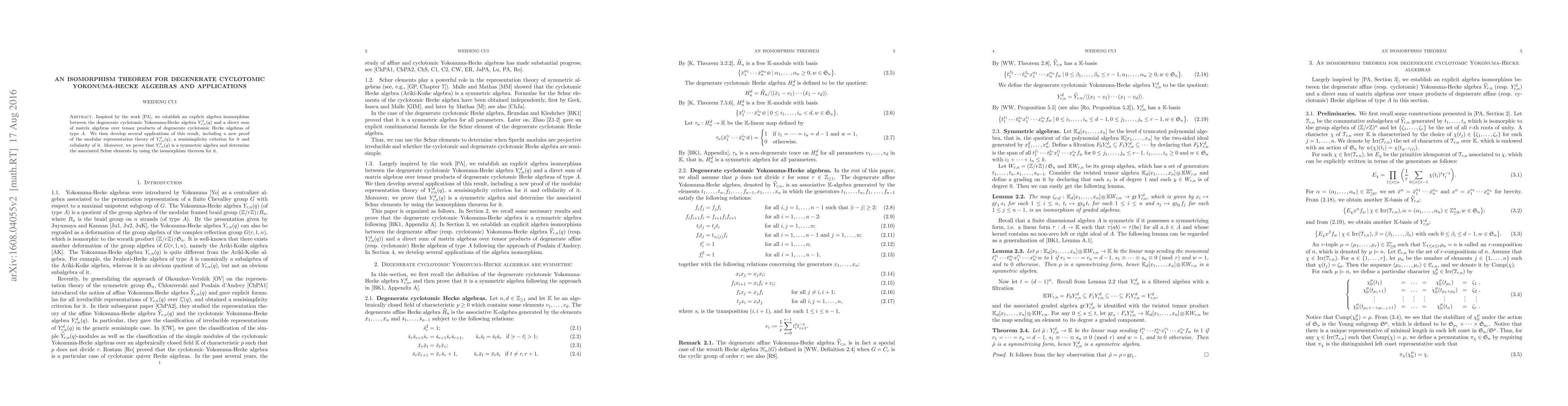 Summary: The paper establishes an explicit isomorphism between degenerate cyclotomic Yokonuma-Hecke algebras and a direct sum of matrix algebras, providing new proofs and criteria for their modular representation theory, semisimplicity, cellularity, and symmetry, and determining Schur elements.