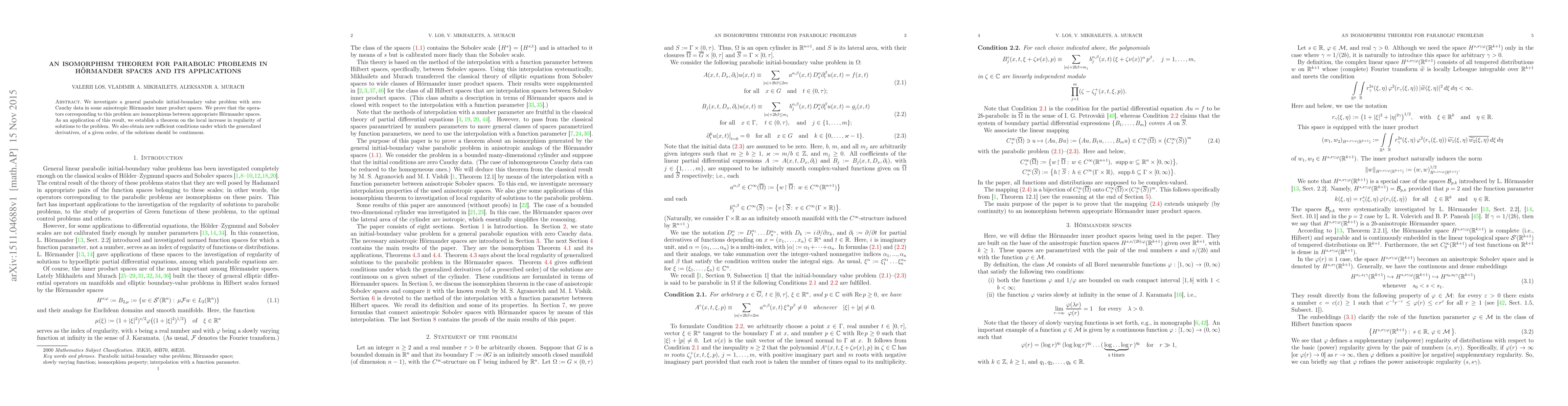 This paper proves an isomorphism theorem for parabolic problems in H\"ormander spaces, demonstrating that the corresponding operators are isomorphisms between appropriate spaces. The result is applied to establish a theorem on the local increase in regularity of solutions and to derive new sufficient conditions for continuity of generalized derivatives.