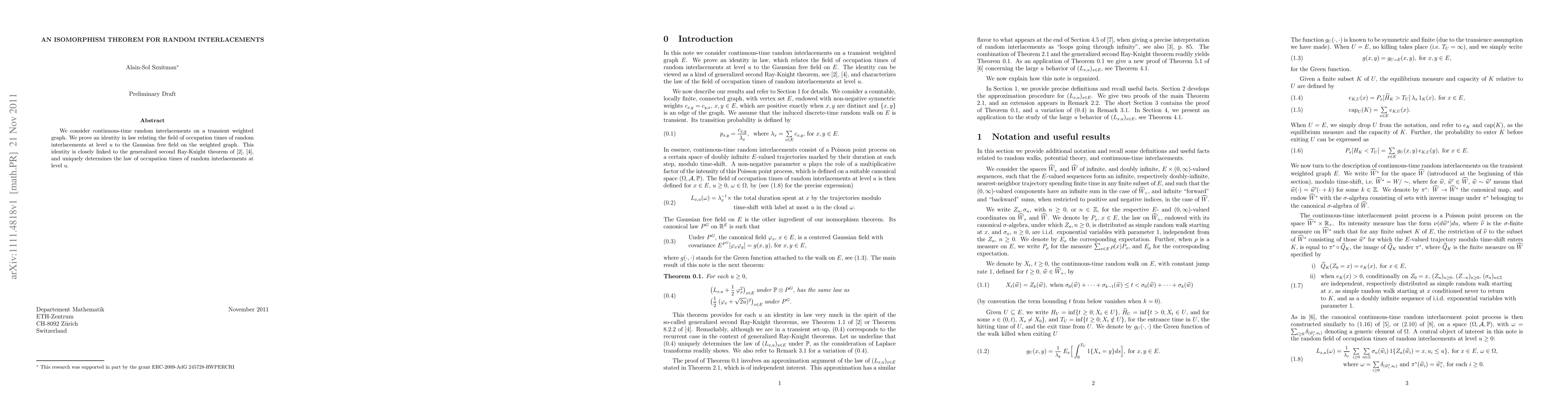 This paper establishes an isomorphism theorem for random interlacements on transient weighted graphs, proving an identity in law between the occupation times of random interlacements and the Gaussian free field, which is connected to the generalized second Ray-Knight theorem.