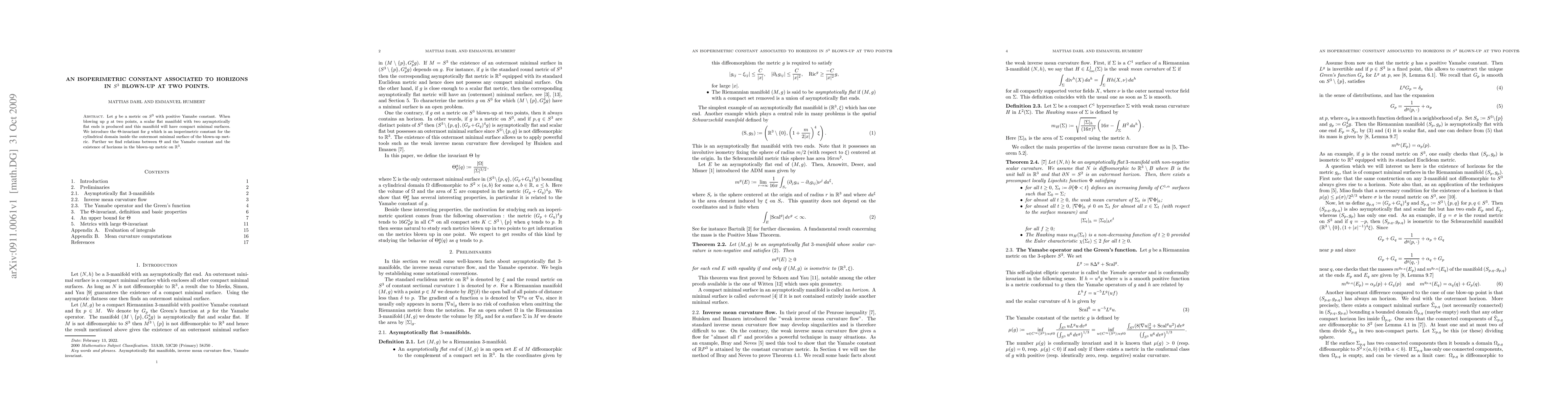 Let $g$ be a metric on $S^3$ with positive Yamabe constant. When blowing up $g$ at two points, a scalar flat manifold with two asymptotically flat ends is produced and this manifold will have compact minimal surfaces. We introduce the $\Th$-invariant for $g$ which is an isoperimetric constant for the cylindrical domain inside the outermost minimal surface of the blown-up metric. Further we find relations between $\Th$ and the Yamabe constant and the existence of horizons in the blown-up metric on $\mR^3$.