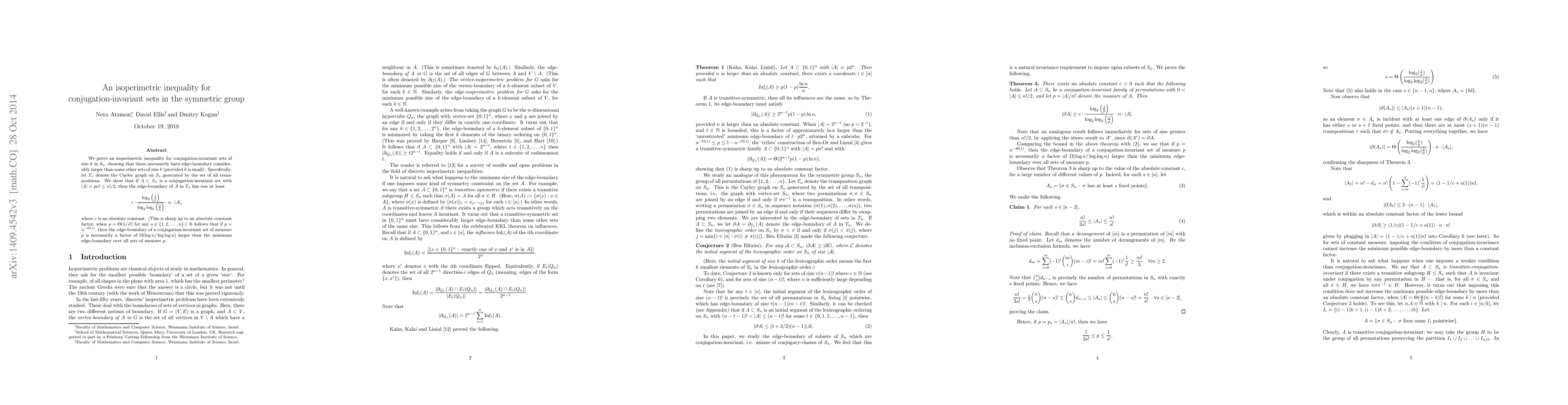 Researchers prove an isoperimetric inequality for conjugation-invariant sets in the symmetric group, showing that these sets have a significantly larger edge-boundary than similar-sized sets, especially when the set size is small compared to n.