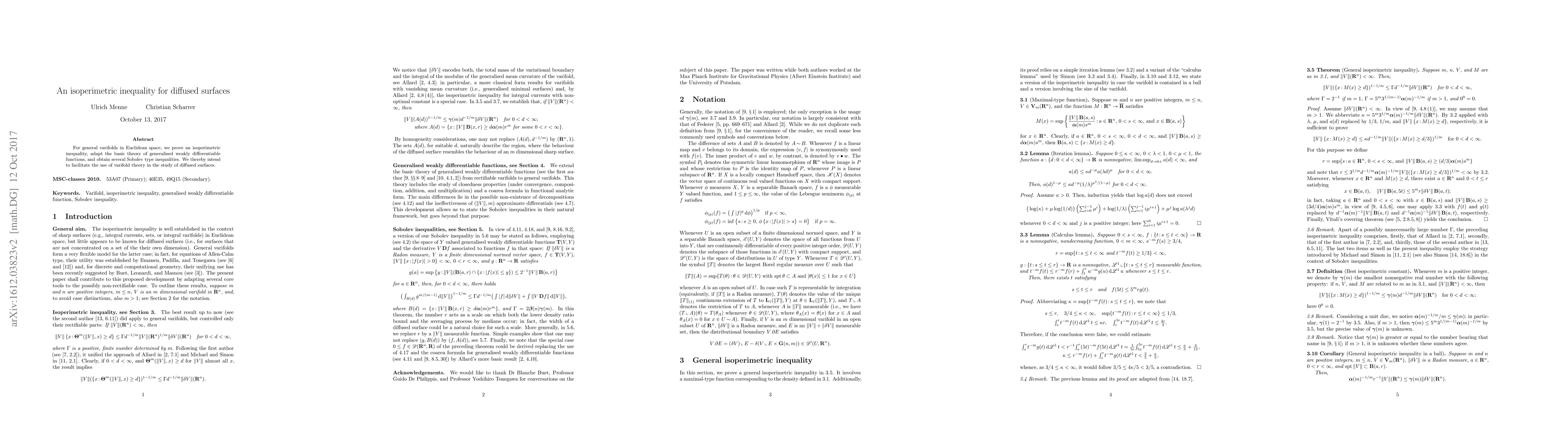 For general varifolds in Euclidean space, we prove an isoperimetric inequality, adapt the basic theory of generalised weakly differentiable functions, and obtain several Sobolev type inequalities. We thereby intend to facilitate the use of varifold theory in the study of diffused surfaces.