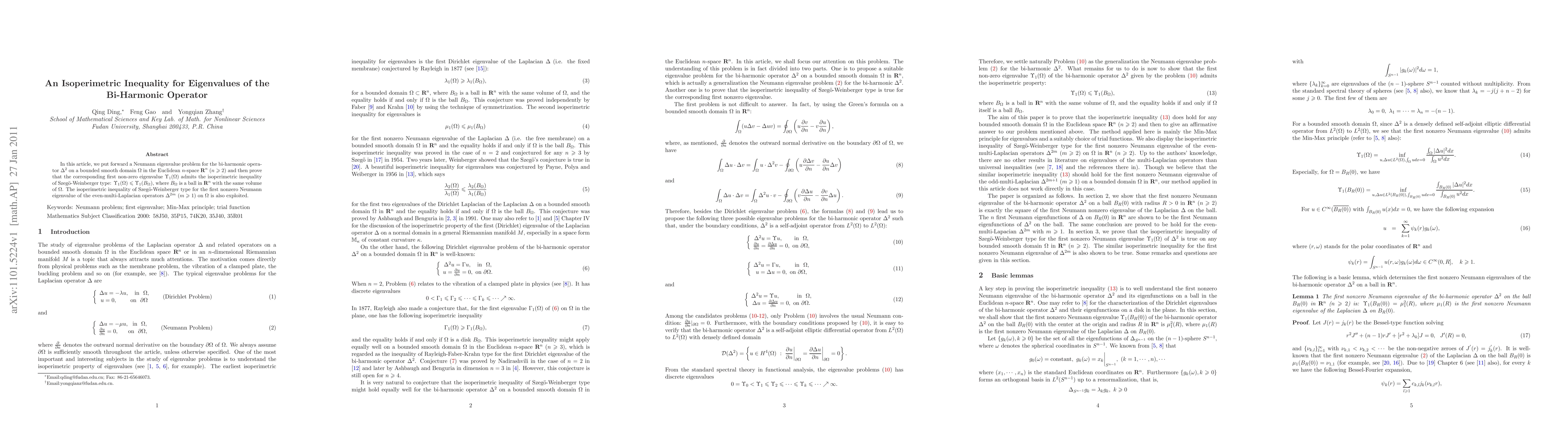 This paper establishes a Neumann eigenvalue problem for the bi-harmonic operator $\Delta^2$ on a smooth domain in ${\bf R}^n$ and proves an isoperimetric inequality for its first non-zero eigenvalue, showing it is minimized by a ball of the same volume. The study also extends this inequality to even-multi-Laplacian operators $\Delta^{2m}$.