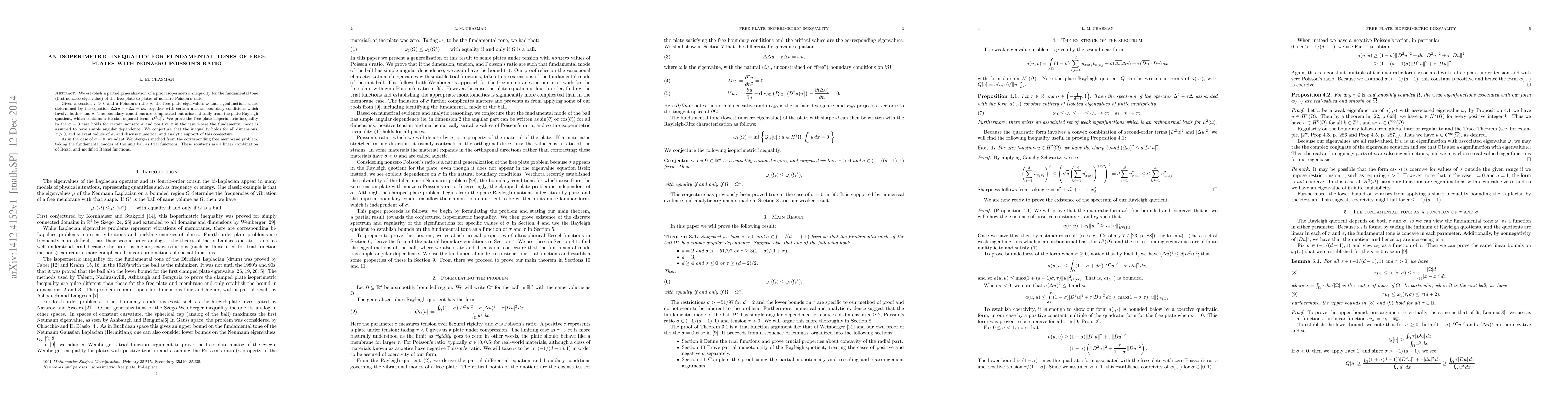 Researchers establish a partial generalization of an isoperimetric inequality for free plates with nonzero Poisson's ratio, finding a relationship between the plate's shape and its fundamental tone.