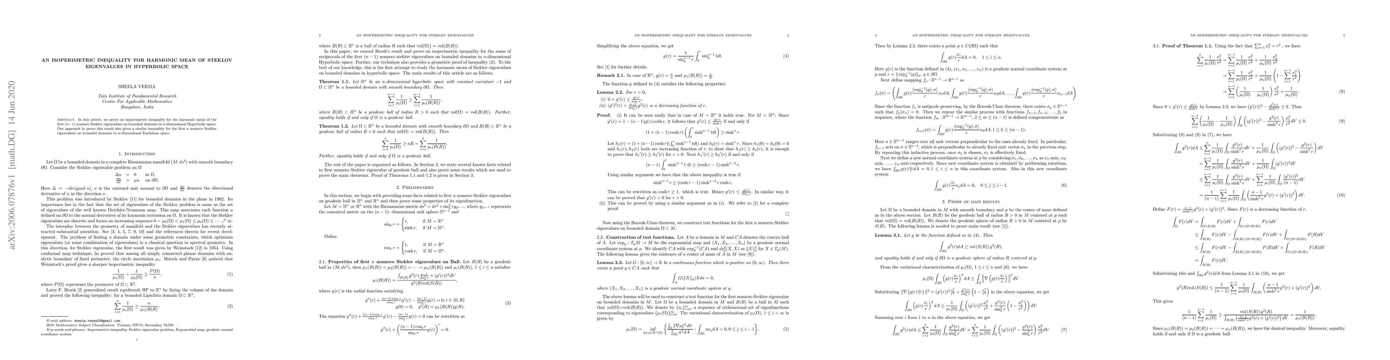 This paper proves an isoperimetric inequality for the harmonic mean of the first $(n-1)$ nonzero Steklov eigenvalues in $n$-dimensional hyperbolic space, extending the result to the first $n$ nonzero Steklov eigenvalues in $n$-dimensional Euclidean space.
