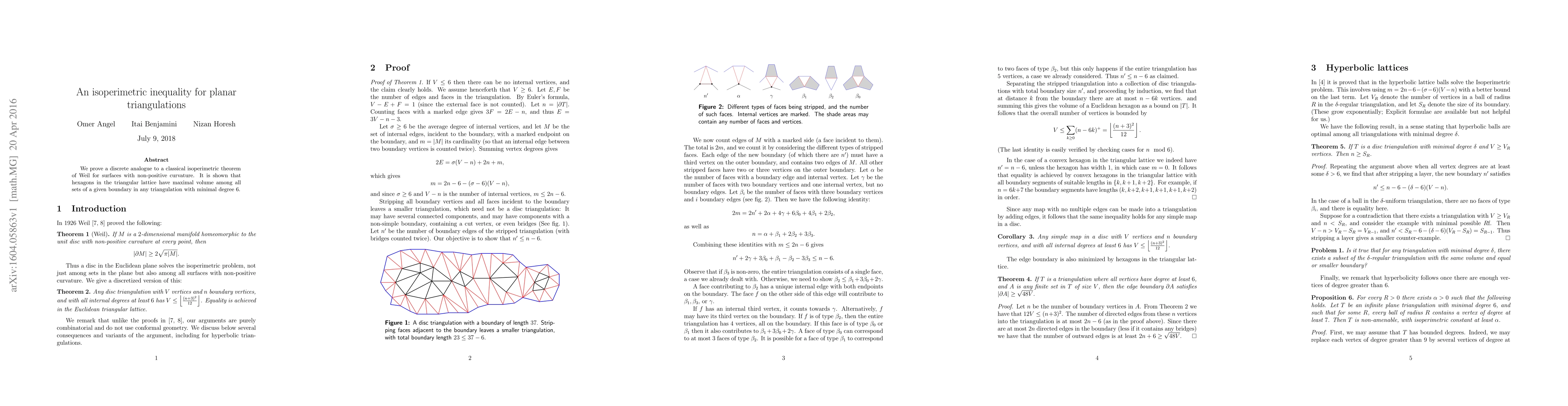 Summary: This paper establishes a discrete isoperimetric inequality for planar triangulations, demonstrating that hexagons maximize volume for a given boundary in triangulations with minimal degree 6, analogous to Weil's classical isoperimetric theorem for surfaces with non-positive curvature.