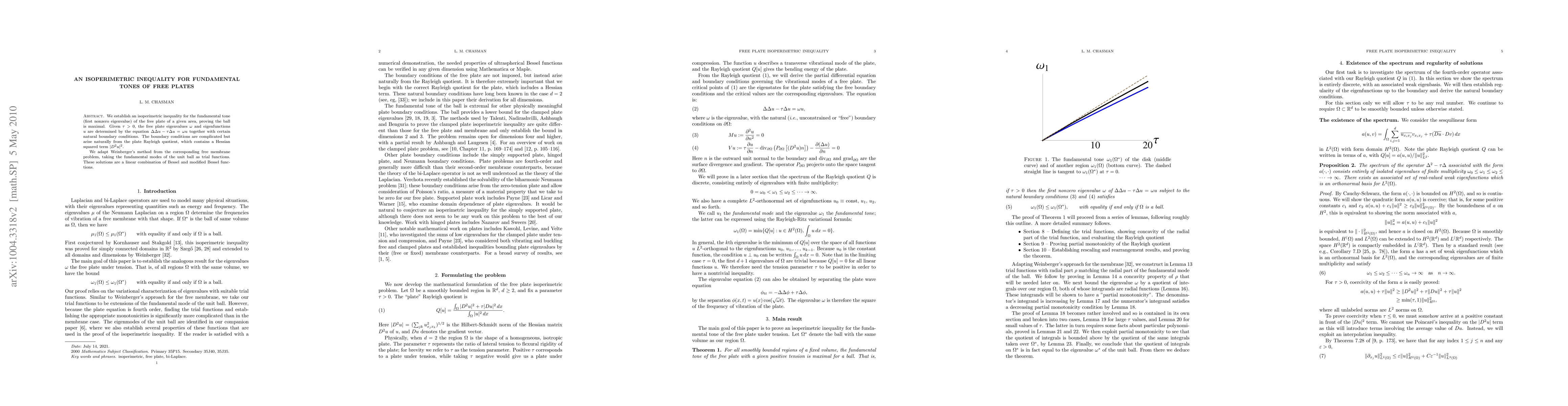 We establish an isoperimetric inequality for the fundamental tone (first nonzero eigenvalue) of the free plate of a given area, proving the ball is maximal. Given $\tau>0$, the free plate eigenvalues $\omega$ and eigenfunctions $u$ are determined by the equation $\Delta\Delta u-\tau\Delta u = \omega u$ together with certain natural boundary conditions. The boundary conditions are complicated but arise naturally from the plate Rayleigh quotient, which contains a Hessian squared term $|D^2u|^2$. We adapt Weinberger's method from the corresponding free membrane problem, taking the fundamental modes of the unit ball as trial functions. These solutions are a linear combination of Bessel and modified Bessel functions.