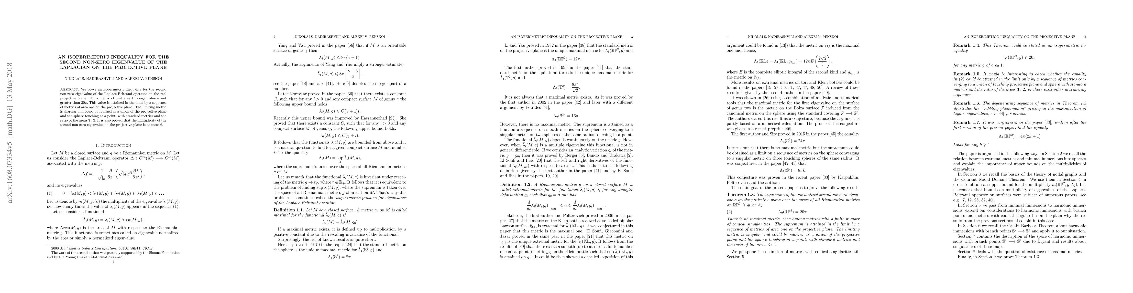 Researchers proved an isoperimetric inequality for the second non-zero eigenvalue of the Laplacian on the real projective plane, showing it's not greater than 20Ø