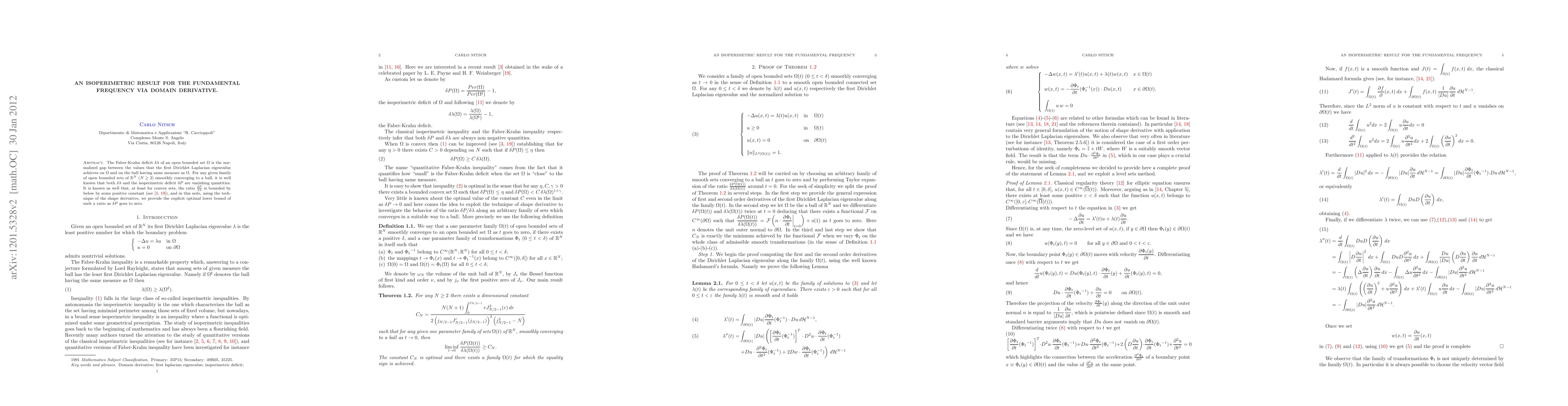 A mathematical proof provides an explicit lower bound for the ratio of isoperimetric deficit to Faber-Krahn deficit in open bounded sets that smoothly converge to a ball, offering insight into the fundamental frequency via domain derivative.