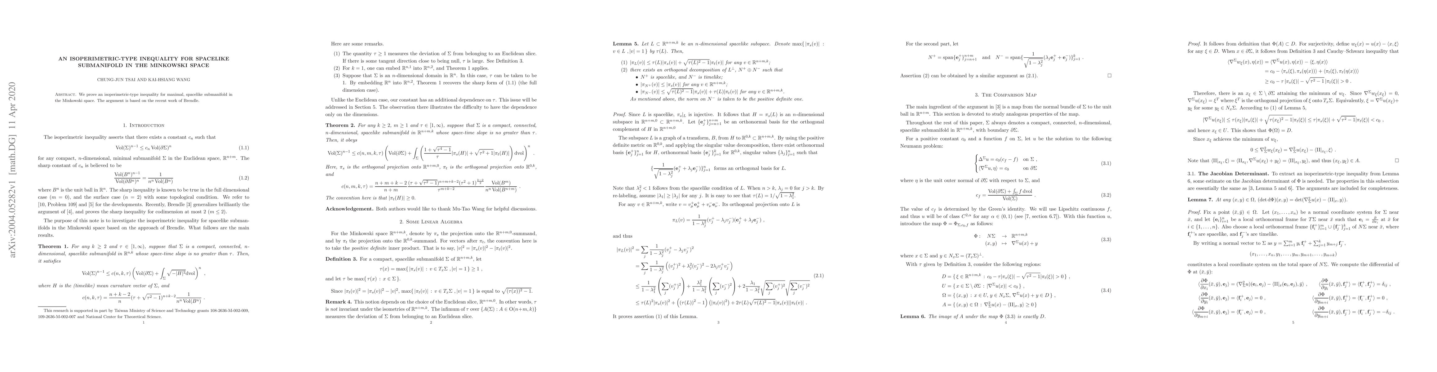 Summary: This paper establishes an isoperimetric-type inequality for maximal, spacelike submanifolds in Minkowski space, utilizing techniques from recent work by Brendle to derive the result.