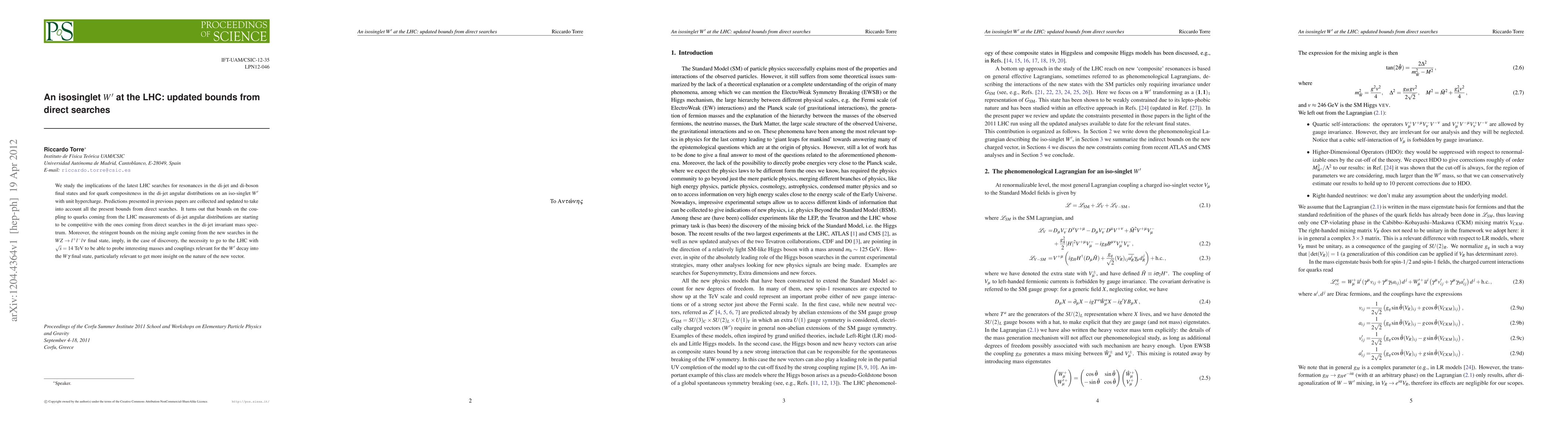 We study the implications of the latest LHC searches for resonances in the di-jet and di-boson final states and for quark compositeness in the di-jet angular distributions on an iso-singlet W' with unit hypercharge. Predictions presented in previous papers are collected and updated to take into account all the present bounds from direct searches. It turns out that bounds on the coupling to quarks coming from the LHC measurements of di-jet angular distributions are starting to be competitive with the ones coming from direct searches in the di-jet invariant mass spectrum. Moreover, the stringent bounds on the mixing angle coming from the new searches in the $WZ\to l^{+}l^{-}l\nu$ final state, imply, in the case of discovery, the necessity to go to the LHC with $\sqrt{s}=14$ TeV to be able to probe interesting masses and couplings relevant for the W' decay into the W\gamma\ final state, particularly relevant to get more insight on the nature of the new vector.
