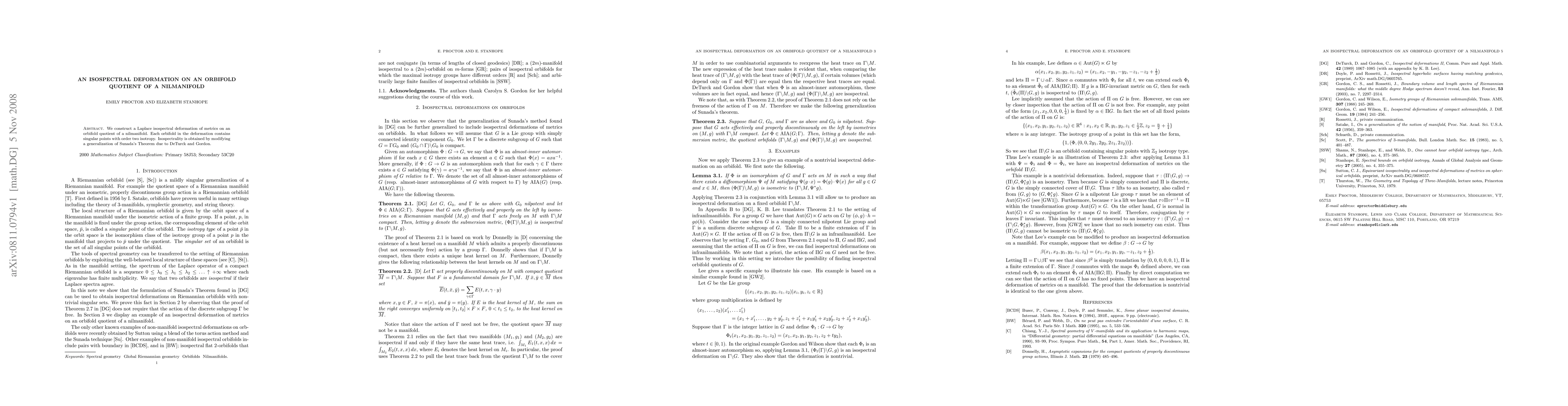 This paper constructs a Laplace isospectral deformation on an orbifold quotient of a nilmanifold, maintaining isospectrality through modifications of DeTurck and Gordon's generalization of Sunada's Theorem, while incorporating singular points with order two isotropy.