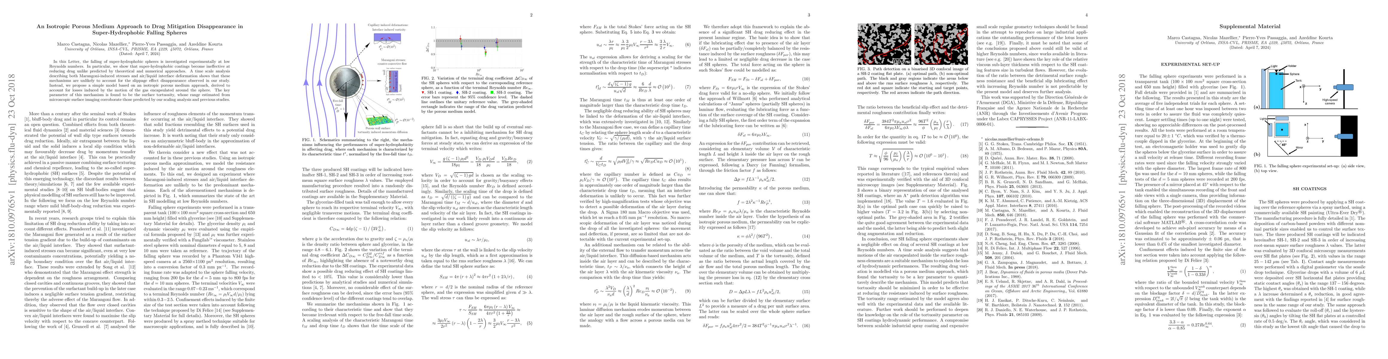This paper experimentally investigates the drag reduction in low Reynolds number falling super-hydrophobic spheres, finding that these coatings fail to reduce drag as predicted. The authors propose an isotropic porous medium model to explain the observed disappearance of the slippage effect, attributing it to gas encapsulated around the sphere and validated by surface tortuosity analysis.
