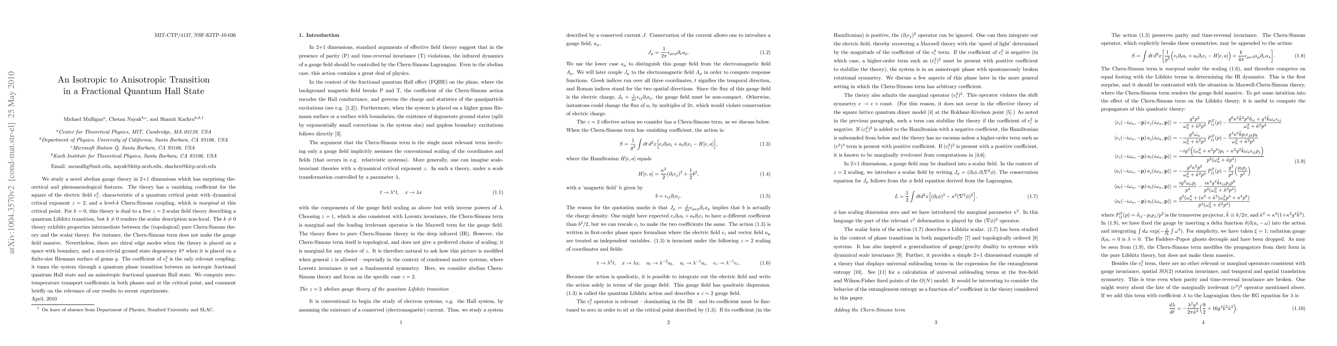Researchers study a novel abelian gauge theory with unique properties, including a quantum critical point and intermediate behavior between topological theories and scalar field theories, which they use to describe an isotropic to anisotropic transition in fractional quantum Hall states.