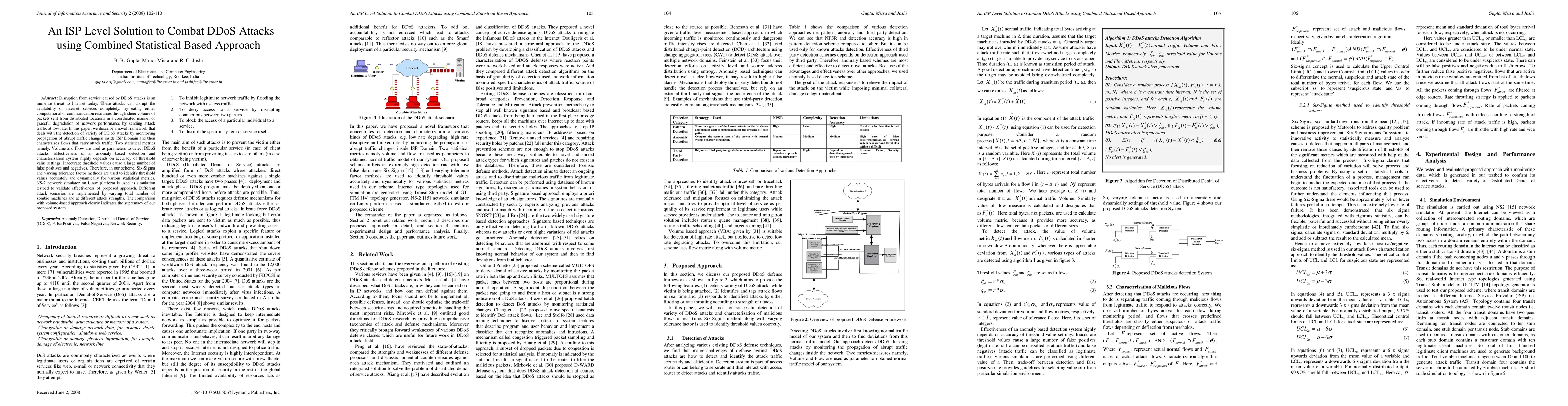 This paper proposes a novel ISP-level framework to detect and mitigate DDoS attacks using statistical metrics Volume and Flow, with thresholds dynamically set via Six-Sigma and tolerance factor methods to minimize false positives/negatives. Simulation results show superior performance compared to volume-based approaches.