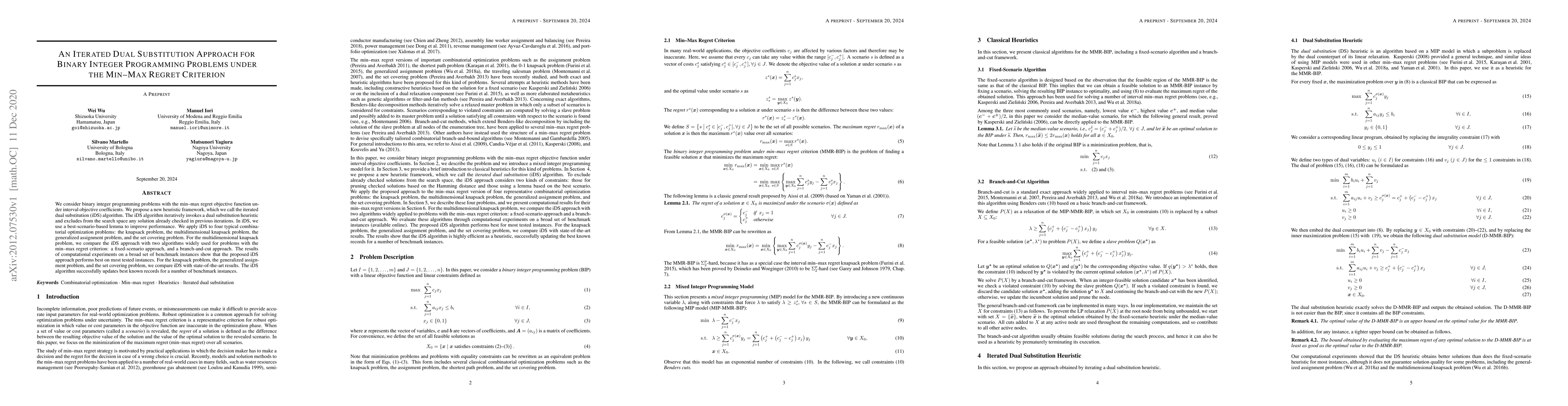 The paper proposes an iterated dual substitution (iDS) algorithm for solving binary integer programming problems with a min-max regret objective under interval objective coefficients. The iDS algorithm iteratively refines solutions and outperforms existing methods on several combinatorial optimization problems.