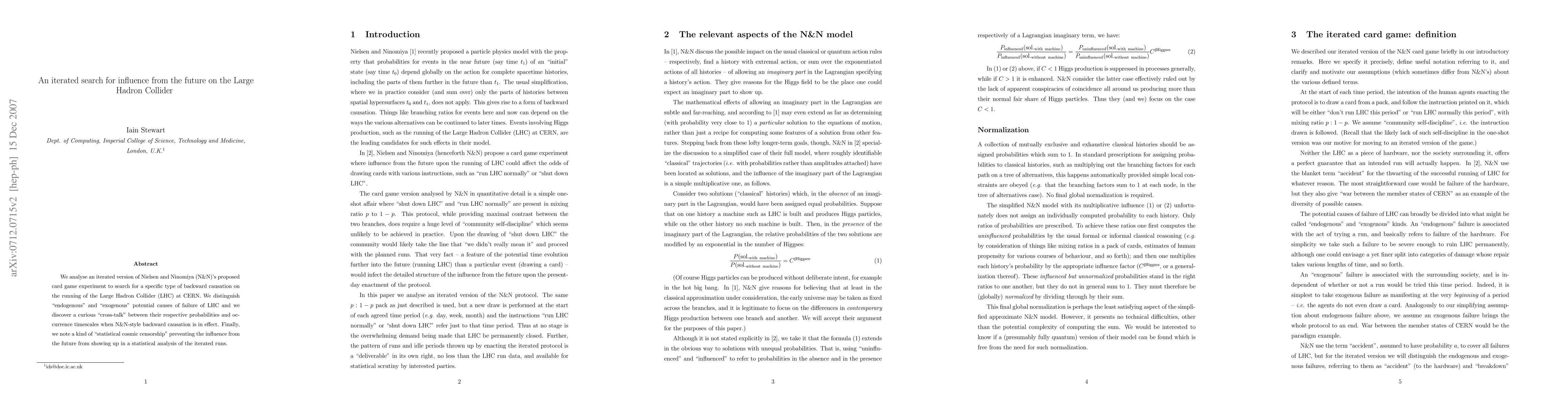 We analyse an iterated version of Nielsen and Ninomiya (N&N)'s proposed card game experiment to search for a specific type of backward causation on the running of the Large Hadron Collider (LHC) at CERN. We distinguish "endogenous" and "exogenous" potential causes of failure of LHC and we discover a curious "cross-talk" between their respective probabilities and occurrence timescales when N&N-style backward causation is in effect. Finally, we note a kind of "statistical cosmic censorship" preventing the influence from the future from showing up in a statistical analysis of the iterated runs.