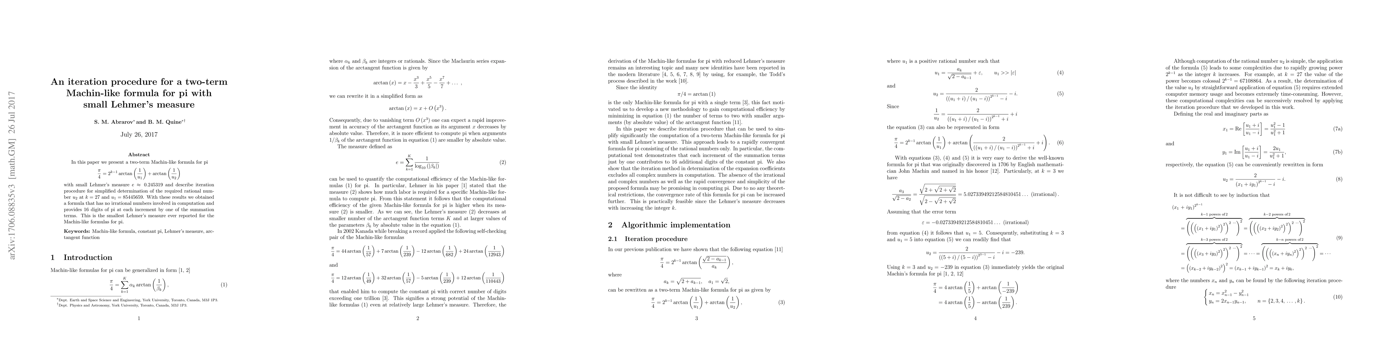 In this paper we present a two-term Machin-like formula for pi \[\frac{\pi}{4} = 2^{k - 1}\arctan\left(\frac{1}{u_1}\right) + \arctan\left(\frac{1}{u_2}\right)\] with small Lehmer's measure $e \approx 0.245319$ and describe iteration procedure for simplified determination of the required rational number $u_2$ at $k = 27$ and $u_1 = 85445659$. With these results we obtained a formula that has no irrational numbers involved in computation and provides $16$ digits of pi at each increment by one of the summation terms. This is the smallest Lehmer's measure ever reported for the Machin-like formulas for pi.