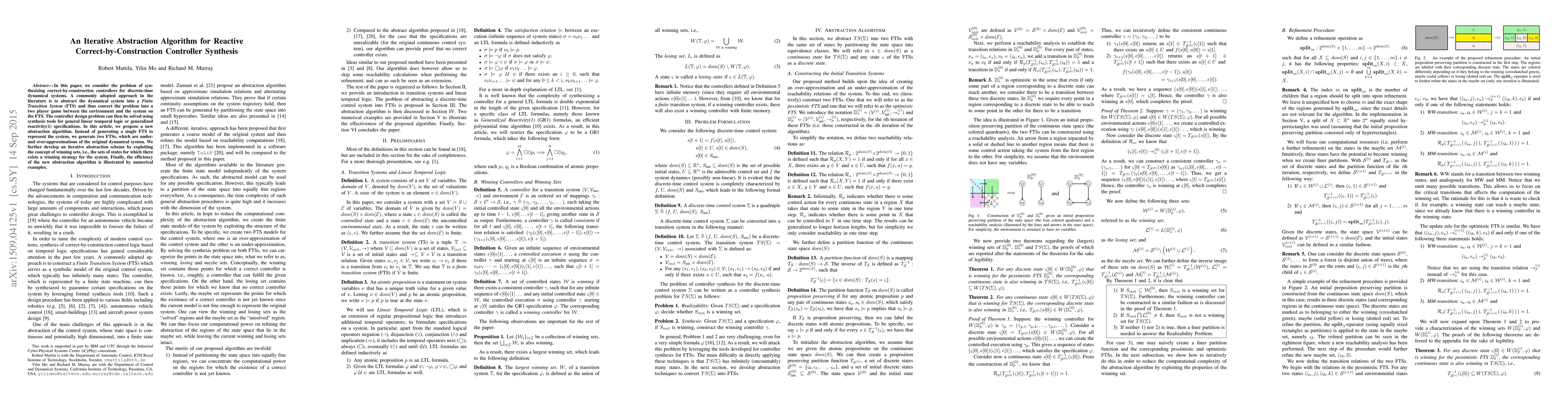 In this paper, we consider the problem of synthesizing correct-by-construction controllers for discrete-time dynamical systems. A commonly adopted approach in the literature is to abstract the dynamical system into a Finite Transition System (FTS) and thus convert the problem into a two player game between the environment and the system on the FTS. The controller design problem can then be solved using synthesis tools for general linear temporal logic or generalized reactivity(1) specifications. In this article, we propose a new abstraction algorithm. Instead of generating a single FTS to represent the system, we generate two FTSs, which are under- and over-approximations of the original dynamical system. We further develop an iterative abstraction scheme by exploiting the concept of winning sets, i.e., the sets of states for which there exists a winning strategy for the system. Finally, the efficiency of the new abstraction algorithm is illustrated by numerical examples.