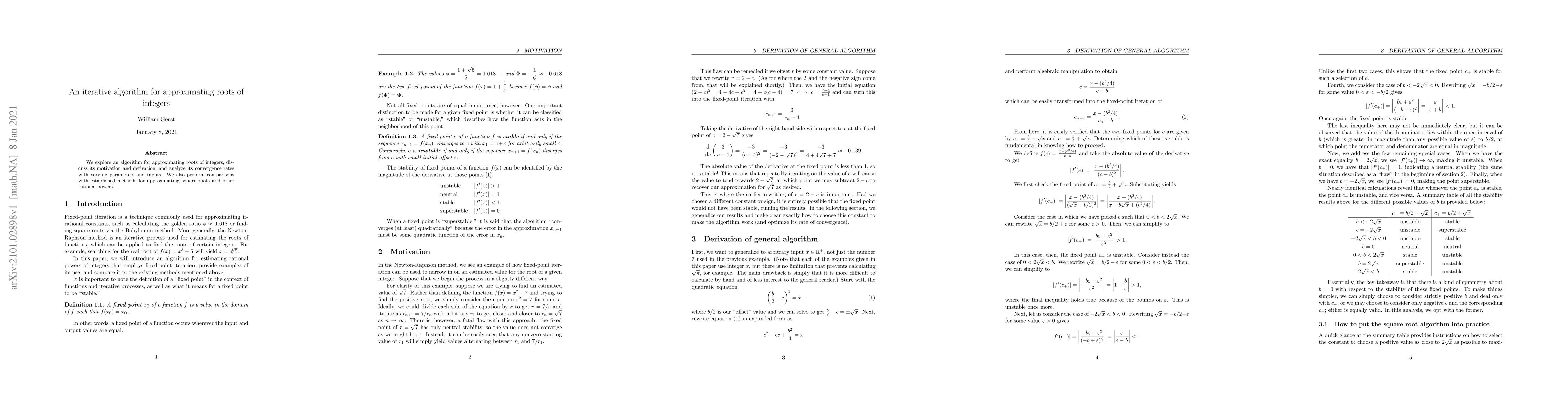 We explore an algorithm for approximating roots of integers, discuss its motivation and derivation, and analyze its convergence rates with varying parameters and inputs. We also perform comparisons with established methods for approximating square roots and other rational powers.