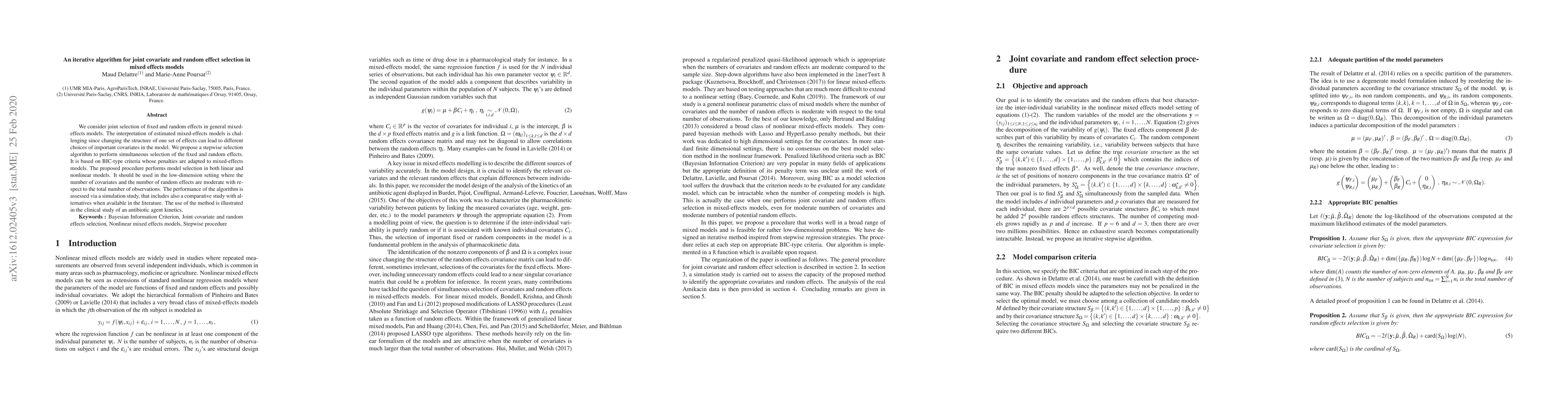 This paper proposes a stepwise selection algorithm for joint covariate and random effect selection in mixed-effects models, based on BIC-type criteria adapted for such models. The algorithm is evaluated through simulations and applied to a clinical study of antibiotic kinetics.