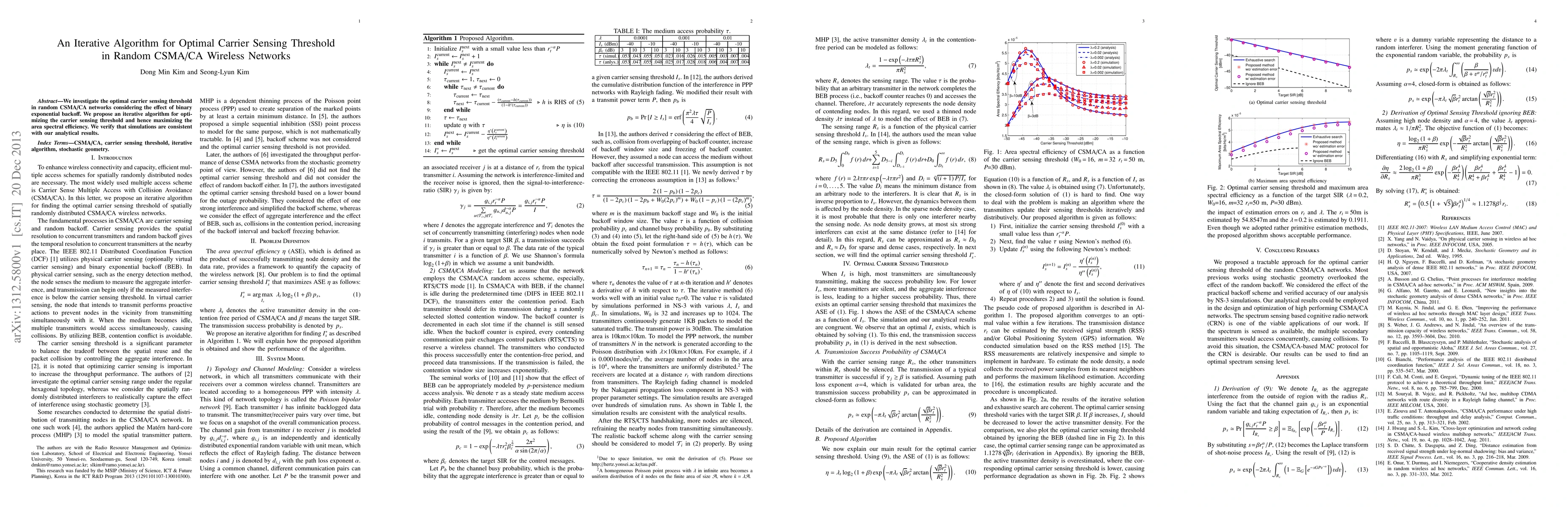 This paper proposes an iterative algorithm to determine the optimal carrier sensing threshold in random CSMA/CA wireless networks, aiming to maximize area spectral efficiency while considering binary exponential backoff. Simulation results align with the analytical findings, validating the effectiveness of the proposed method.