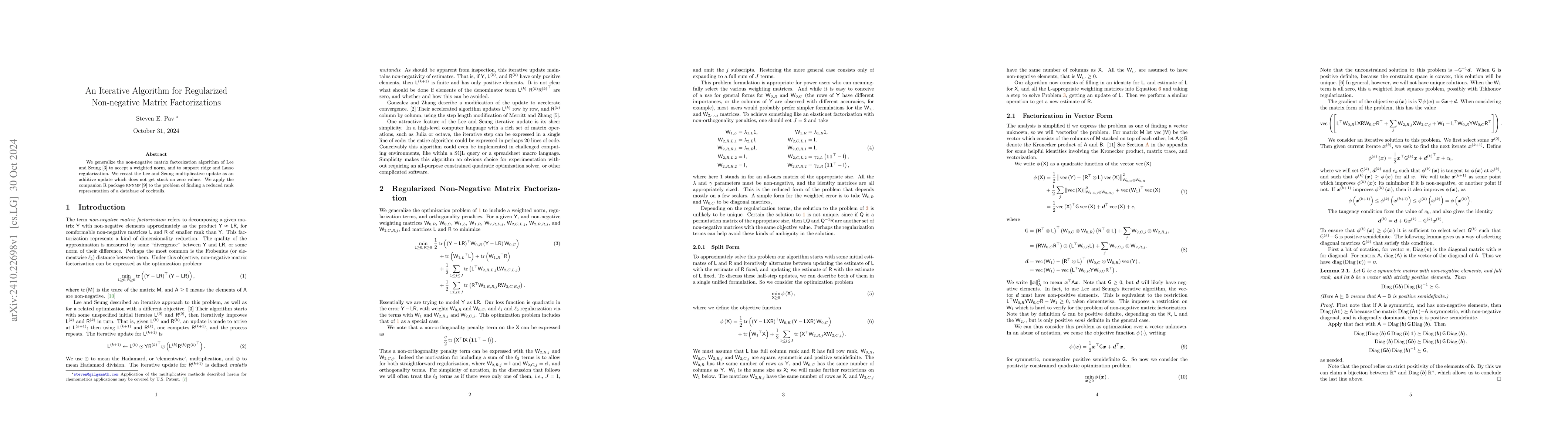 This paper presents an iterative algorithm for regularized non-negative matrix factorization that generalizes Lee and Seung’s method to include weighted norms and ridge/Lasso regularization. An additive update replaces the multiplicative update to avoid zero values, demonstrated through an R package on cocktail data.
