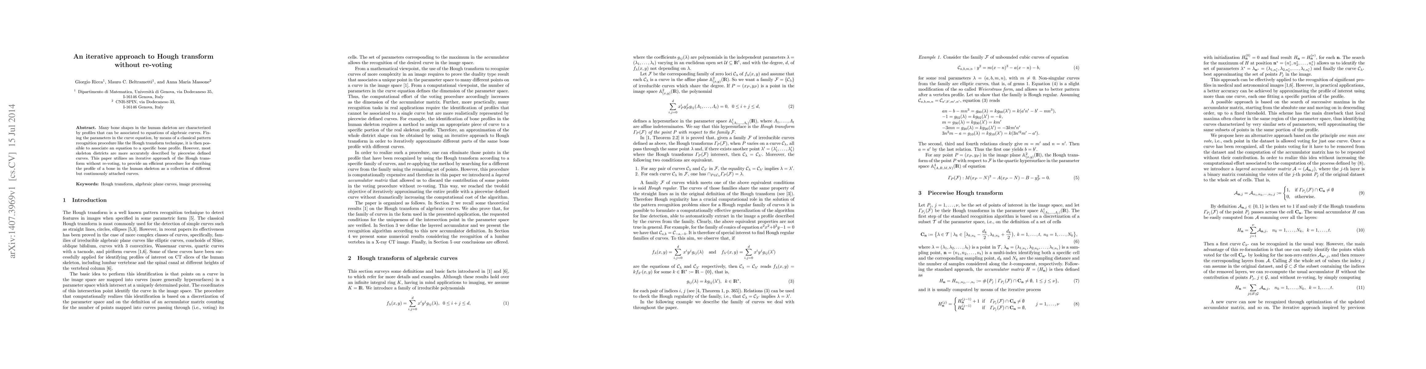 This paper proposes an iterative method for the Hough transform that avoids re-voting, allowing for efficient identification of piecewise algebraic curves to describe bone profiles in the human skeleton. The approach enables the accurate modeling of complex, continuously attached bone shapes.