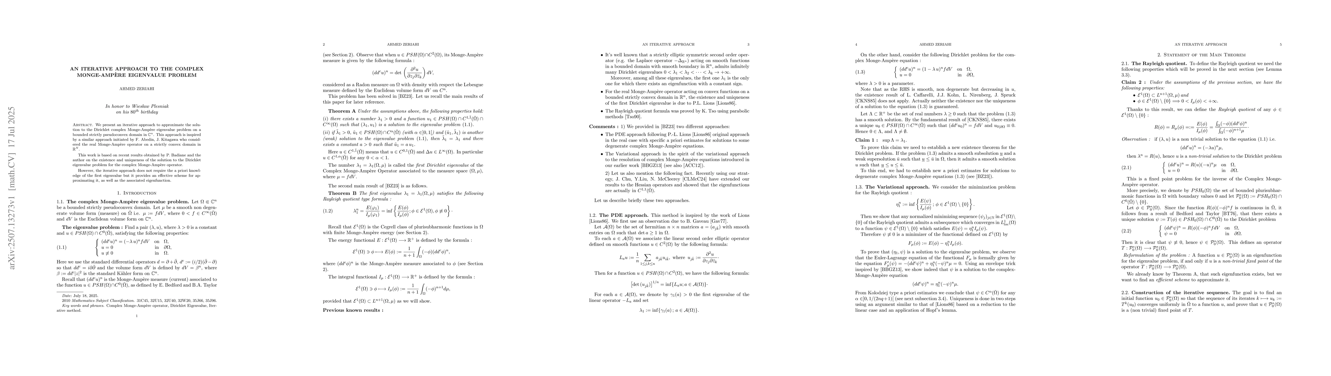 We present an iterative approach to approximate the solution to the Dirichlet complex Monge-Amp\`ere eigenvalue problem on a bounded strictly pseudoconvex domain in $\C^n$. This approach is inspired by a similar approach initiated by F. Abedin, J. Kitagawa who considered the real Monge-Amp\`ere operator on a strictly convex domain in $\R^N$.