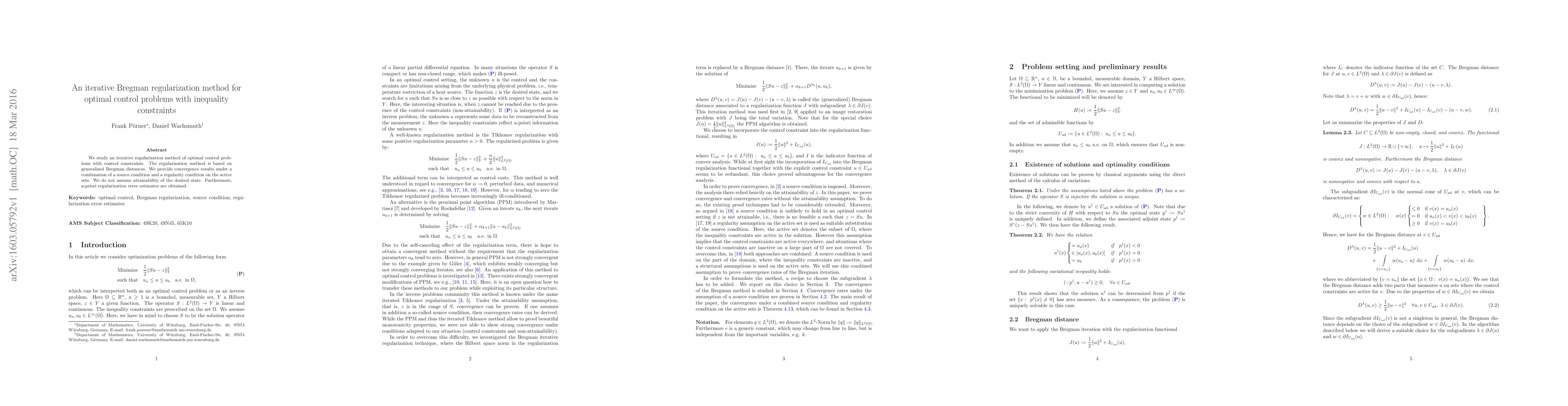 We study an iterative regularization method of optimal control problems with control constraints. The regularization method is based on generalized Bregman distances. We provide convergence results under a combination of a source condition and a regularity condition on the active sets. We do not assume attainability of the desired state. Furthermore, a-priori regularization error estimates are obtained.