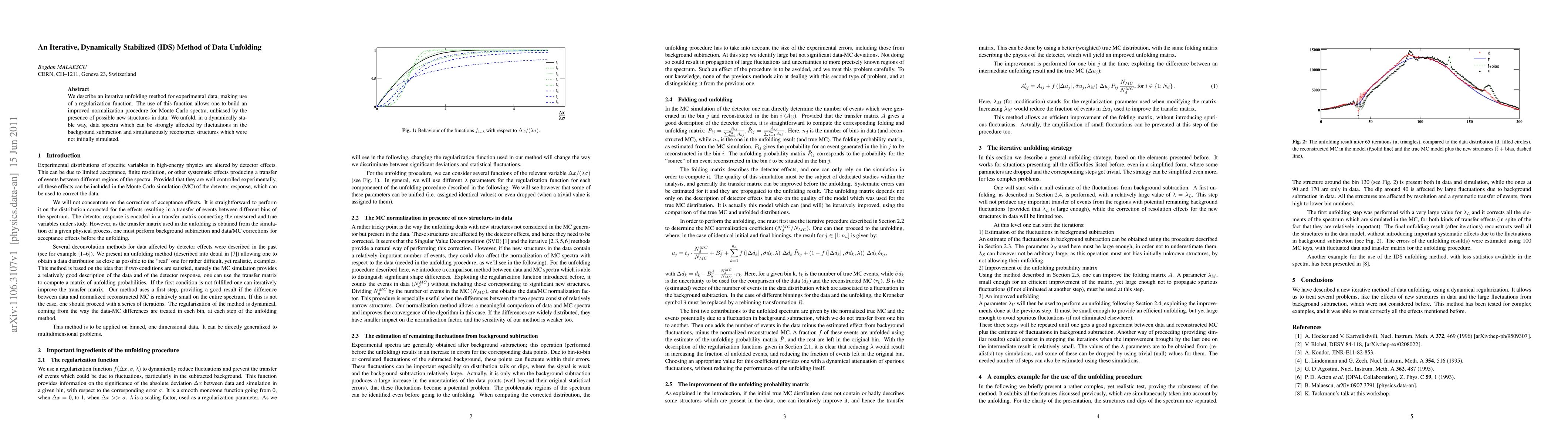 The research introduces an iterative, dynamically stabilized (IDS) method for data unfolding, utilizing a regularization function to improve normalization procedures for Monte Carlo spectra, unbiased by new structures in data and capable of reconstructing unsimulated structures.