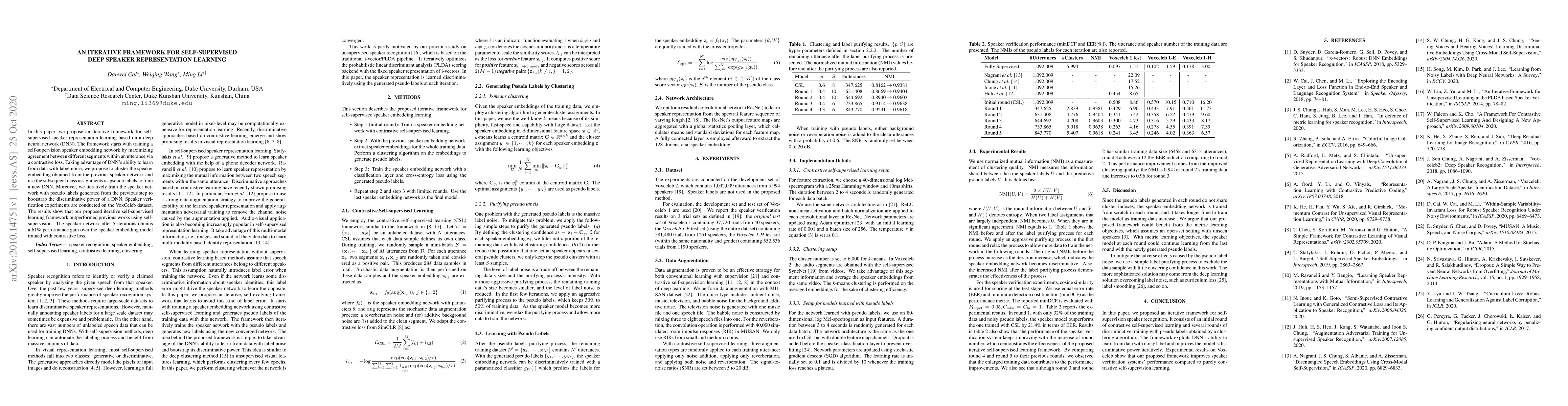This paper introduces an iterative self-supervised framework for deep speaker representation learning using DNNs, which iteratively improves speaker verification performance by leveraging pseudo labels. Experiments on VoxCeleb show a 61% performance gain after five iterations compared to models trained with contrastive loss alone.