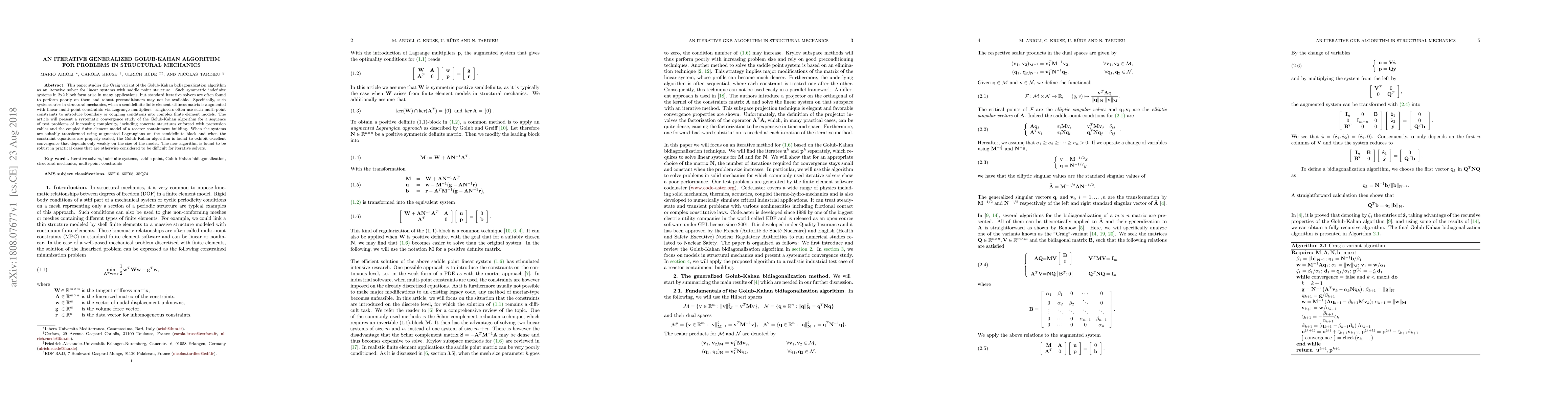 This paper proposes an iterative generalized Golub-Kahan algorithm to solve linear systems with saddle point structure in structural mechanics, demonstrating robust convergence for complex finite element models with multi-point constraints. The algorithm shows excellent performance and weak dependence on model size when systems are appropriately transformed.