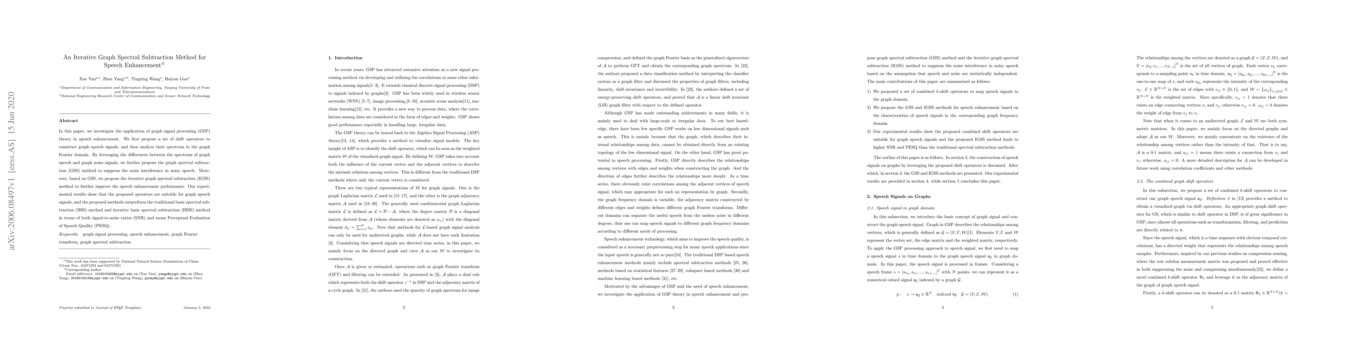 This paper proposes an iterative graph spectral subtraction method for speech enhancement using graph signal processing theory. The method outperforms traditional spectral subtraction methods in terms of signal-to-noise ratio and speech quality.