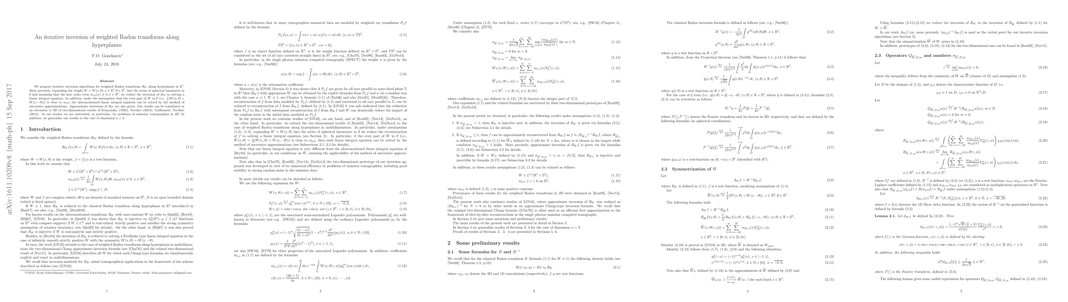 We propose iterative inversion algorithms for weighted Radon transforms $R_W$ along hyperplanes in $R^3$. More precisely, expandingthe weight $W = W (x, \theta), x \in R^3 , \theta \in S^2$ , into the series of spherical harmonics in $\theta$ and assuming that the zero order term $w_{0,0}(x)$ is not zero at any $x \in R^3$ , we reduce the inversion of $R_W$ to solving a linear integral equation. In addition, under the assumption that the even part of $W$ in $\theta$ (i.e., $1/2(W (x, \theta) + W (x, -\theta))$) is close to $w_{0,0}$, the aforementioned linear integral equation can be solved by the method of successive approximations. Approximate inversions of $R_W$ are also given. Our results can be considered as an extension to 3D of two-dimensional results of Kunyansky (1992), Novikov (2014), Guillement, Novikov (2014). In our studies we are motivated, in particular, by problems of emission tomographies in 3D. In addition, we generalize our results to the case of dimension $n > 3$.