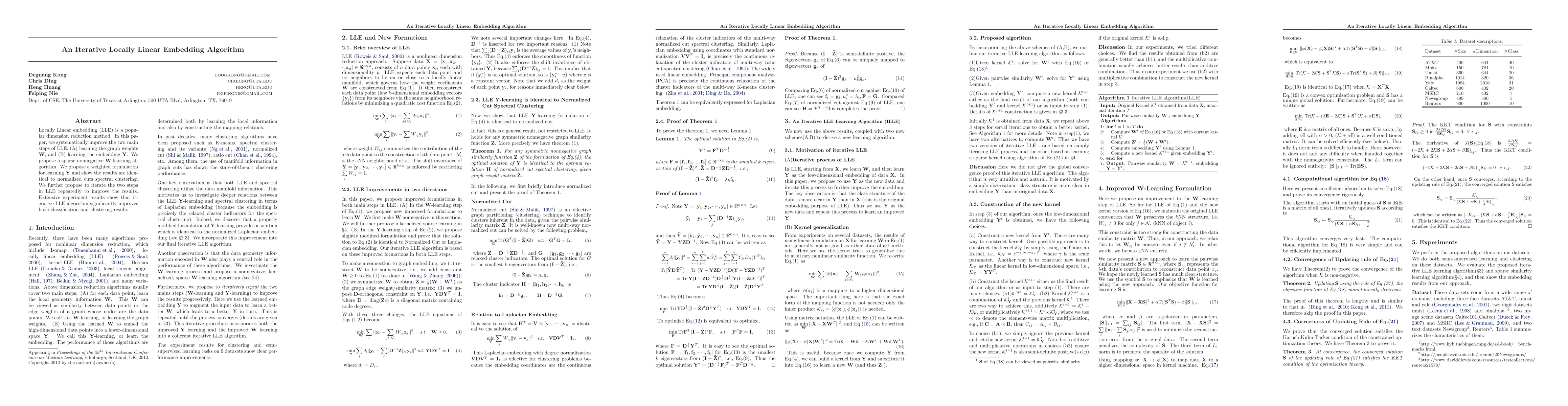 Local Linear embedding (LLE) is a popular dimension reduction method. In this paper, we first show LLE with nonnegative constraint is equivalent to the widely used Laplacian embedding. We further propose to iterate the two steps in LLE repeatedly to improve the results. Thirdly, we relax the kNN constraint of LLE and present a sparse similarity learning algorithm. The final Iterative LLE combines these three improvements. Extensive experiment results show that iterative LLE algorithm significantly improve both classification and clustering results.