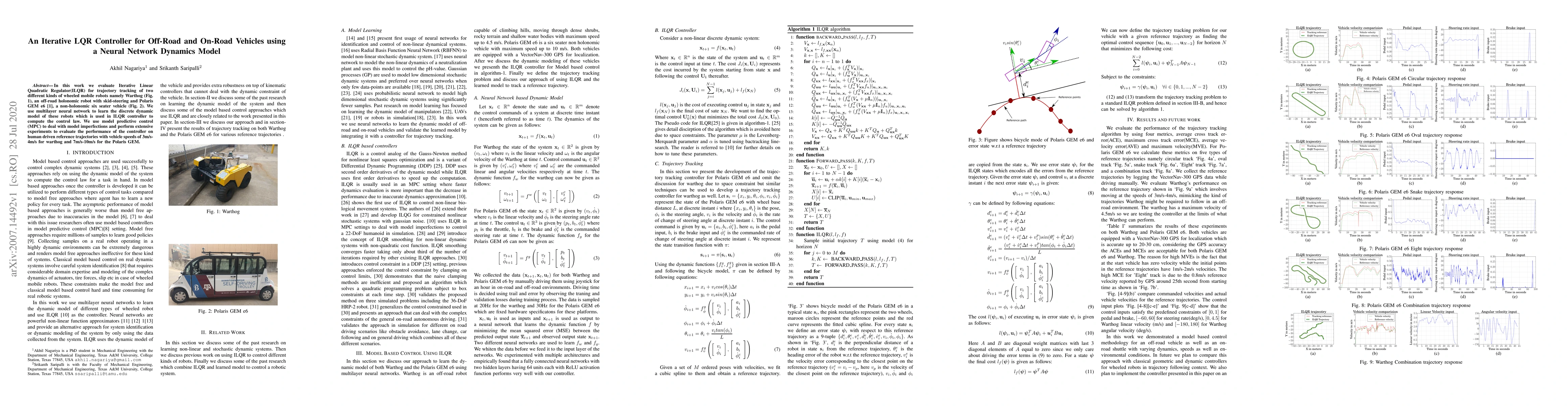 In this work we evaluate Iterative Linear Quadratic Regulator(ILQR) for trajectory tracking of two different kinds of wheeled mobile robots namely Warthog (Fig. 1), an off-road holonomic robot with skid-steering and Polaris GEM e6 [1], a non-holonomic six seater vehicle (Fig. 2). We use multilayer neural network to learn the discrete dynamic model of these robots which is used in ILQR controller to compute the control law. We use model predictive control (MPC) to deal with model imperfections and perform extensive experiments to evaluate the performance of the controller on human driven reference trajectories with vehicle speeds of 3m/s- 4m/s for warthog and 7m/s-10m/s for the Polaris GEM