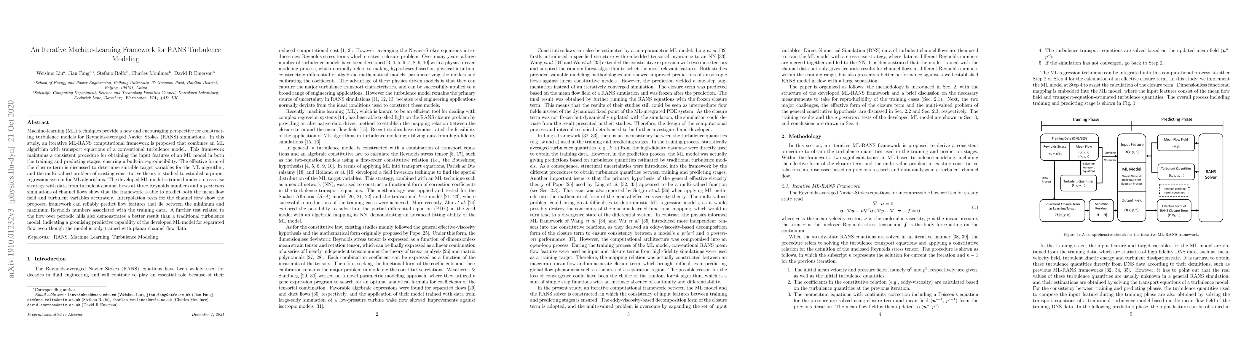 This paper proposes an iterative machine-learning framework for RANS turbulence modeling that combines ML algorithms with conventional turbulence models, achieving accurate predictions of mean flow fields and turbulent variables. The framework demonstrates reliable interpolation between training data Reynolds numbers and outperforms traditional models in predicting flow over periodic hills.