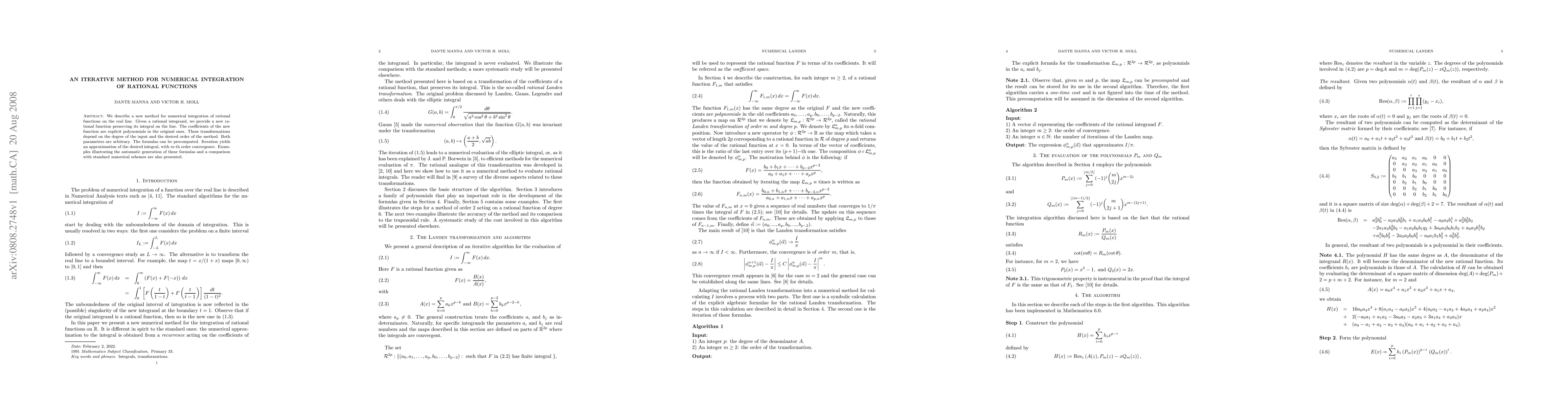 Summary: This paper introduces an iterative method for numerical integration of rational functions using rational Landen transformations, achieving high efficiency in computation. The method leverages these transformations to simplify the integration process.